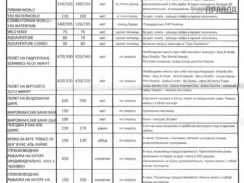 Dubajuje galė site rinktis iš trijų į monių , siū lanč ių ekskursijas po š alį . Pirmieji du Aladdin ir Arabian Knight klientus daugiausia renka Mamzar paplū dimyje ir vieš buč iuose. Netoli į ė jimo į parką , esantį š alia paplū dimio, visada galite sutikti keletą š ių į monių agentų . Naudojomė s abiejų paslaugomis. Ir negalime teikti pirmenybė s nė vienam iš jų . Mus iš metė abu. Č ia ir ten buvo perdangos ir prastas aptarnavimas. Paskutinė je savo istorijoje apie JAE raš iau apie paskutinius ž iaurius atvejus su Arabian Knight. Č ia, kaip pasisektų . Treč ioji kompanija – „Voyage tour“. Tai jū sų š eimininkas, dirbantis su visais pagrindiniais operatoriais ir atsakingas už jų klientų aptarnavimą JAE ir ypač Dubajuje. Č ia bė dų tikimybė gerokai maž esnė , tač iau ekskursijų kaina 10-20 dolerių didesnė . Sprę skite patys. Kad suprastumė te, apie kokias sumas mes kalbame, pridedu nuskaitymą su „Voyage Tour“ kainomis.