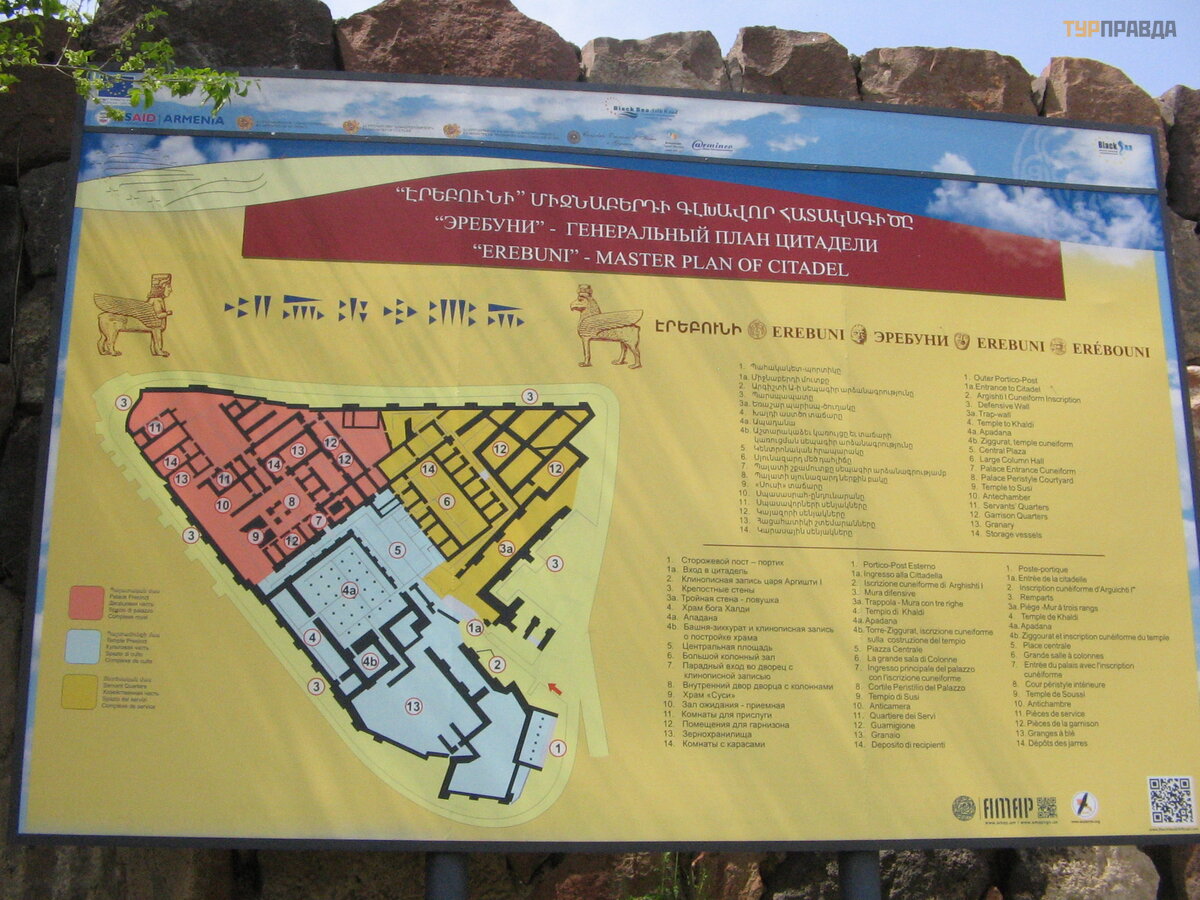 Š tai kodė l į dė jau č ia Erebuni tvirtovė s planą . Turė ti iš anksto, prieš apž iū rą . Laiptai iš muziejaus kyla į kampą , nudaž ytą plane raudonai. Tada, norė dami patekti į tvirtovę , ė jome palei sieną virš Jerevano, apė jome ją iki tos vietos, kur plane stovi raudona rodyklė . Už kampo – portikas su paveikslais (plane [1]). Ir kairė je pusė je esantis „pasas“ apie Jerevano miesto į kū rimą ([2], ž inoma, kopija).