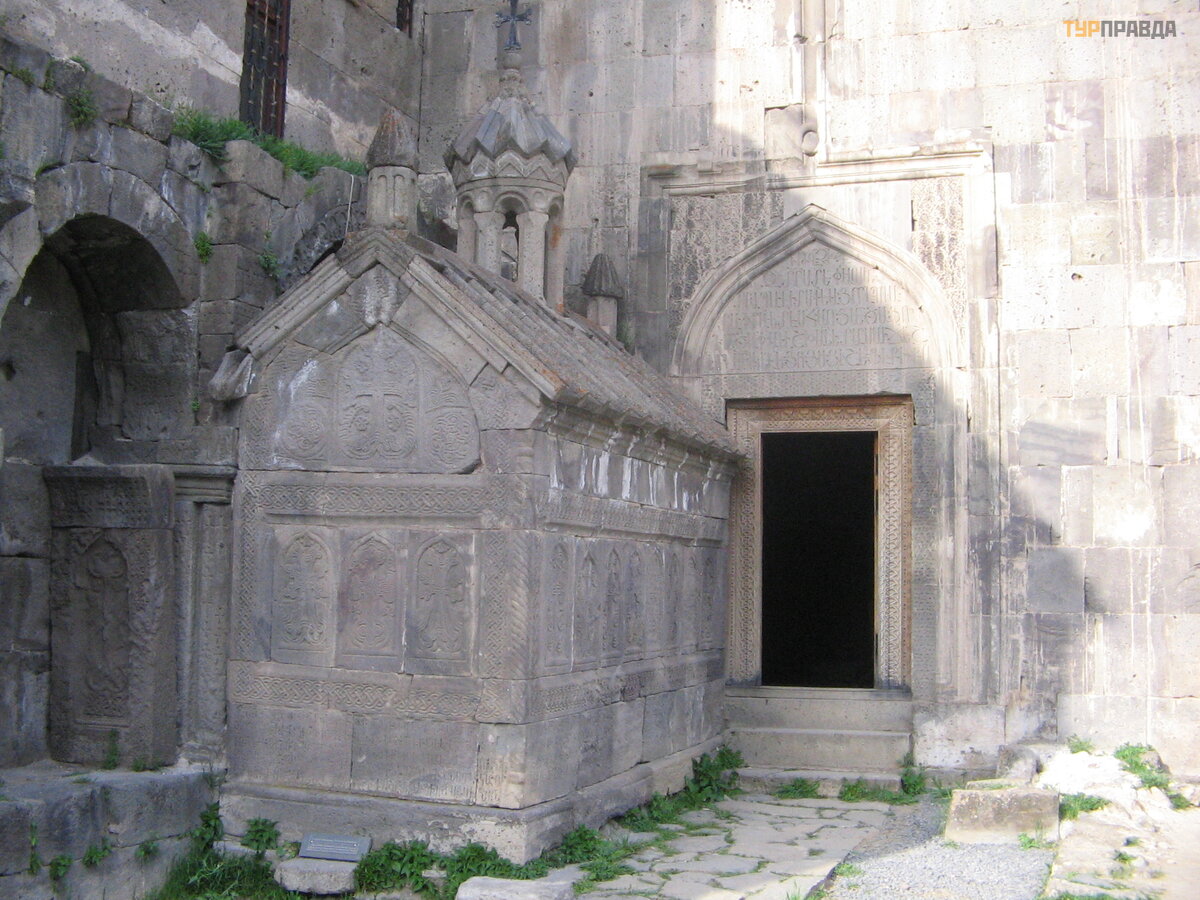 Š v. Grigalius buvo pastatytas vienuolių , kurie pabė go nuo persekiojimo Bizantijoje; prie sienos yra prieangis (XII a. ), pastatytas kunigaikš č io Zakariano, su bareljefais lubose ir skyle. baž nyč ia Š v. Stepana pastatyta iš melsvo bazalto su smulkiomis detalė mis. Kalbant apie Mergelė s baž nyč ią , daroma prielaida, kad jos statyba siekia 10–11 a. , o esamas už raš as (XIII a. ) reiš kia pertvarkymą . Ant sienos yra aukš tas reljefas, vaizduojantis baž nyč ios maketą ir balandį . Refektorius yra antrasis iš dviejų Armė nijoje su dviem kupolais. Ten man netgi į jungė š viesą (kurios, apskritai, kituose vienuolynuose trū ksta). Didž iulė s salė s š onuose yra suoliukai. Kambaryje buvo kaž kokia nuotraukų paroda su senomis nuotraukomis. Deja, nebuvo laiko pamatyti.