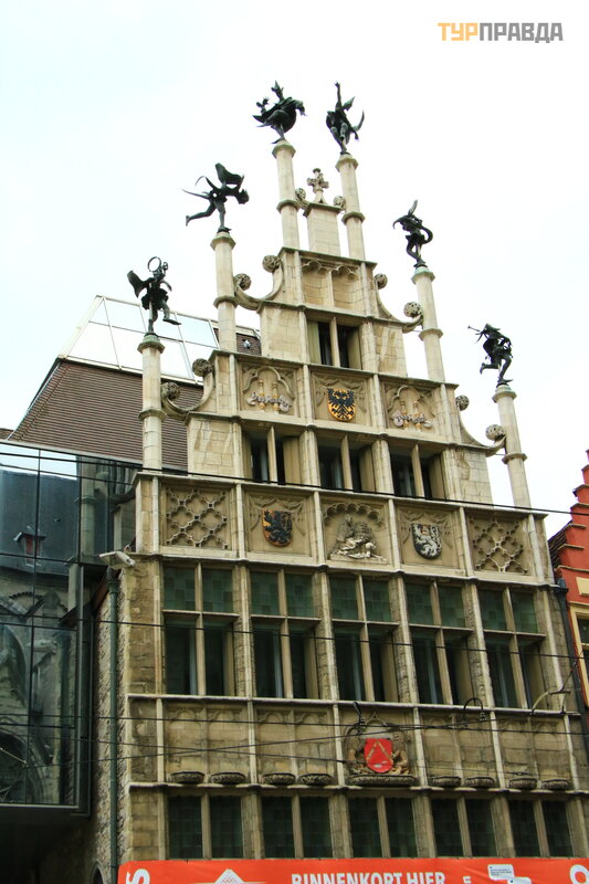 А напротив церкви Святого Николая, на противоположной стороне улицы нашему взору открывается оригинальное здание Гильдии Масонов 16 века. Сверху на фасаде находятся шесть танцоров, которые вращаются вокруг своей оси с помощью ветра.