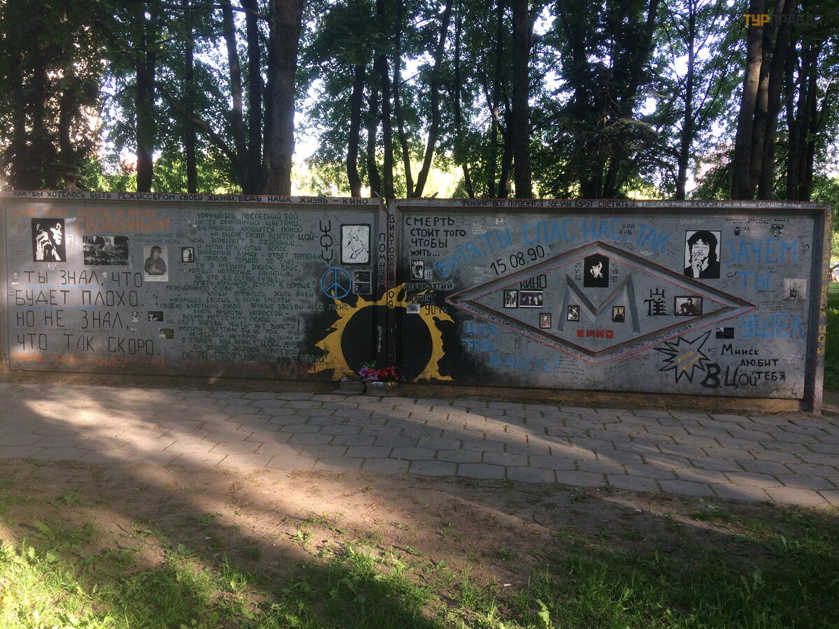 Где-то за стадионом « Динамо» в Ляховсом сквере обнаружили такую стену – Стена Цоя – это фрагмент того самого забора с Октябрьской площади, который в 1990 году превратился в « мемориал» певца.