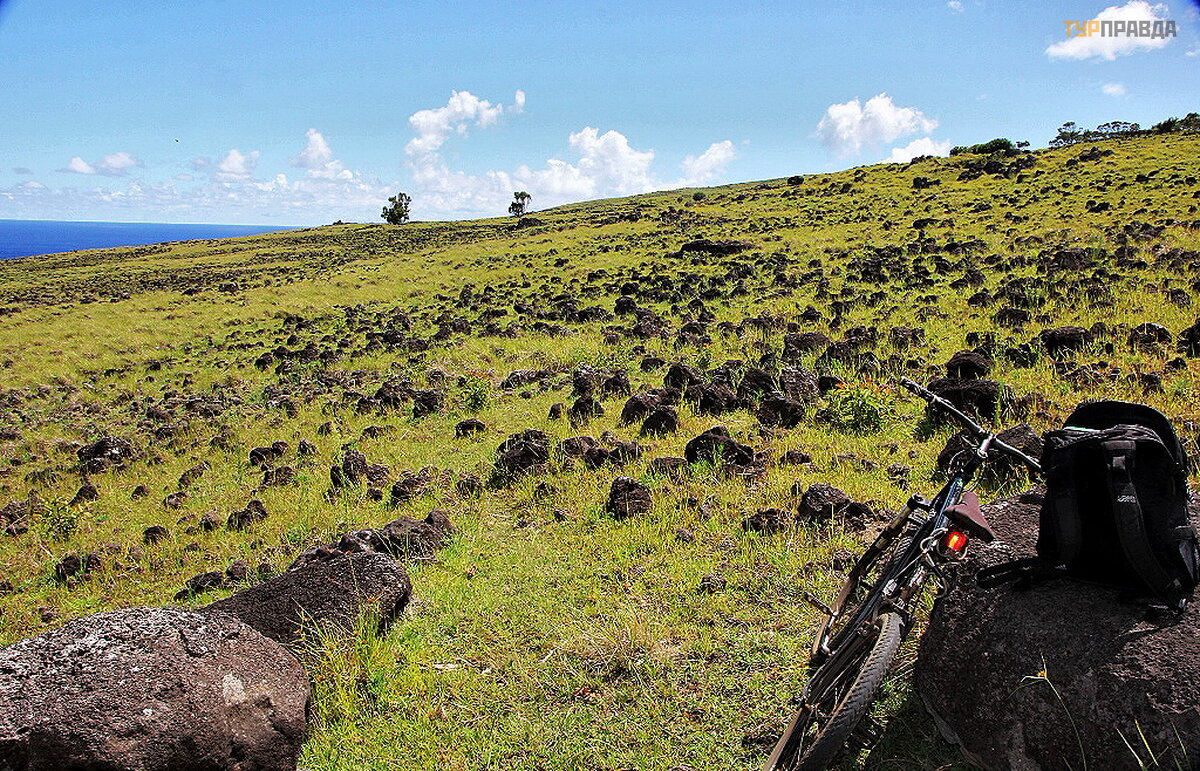 Как я уже говорил, что взял на прокат велосипед. Хотел попробовать объехать остров на нём. Я не учёл одного, что дорога на другой конец острова идёт в гору примерно 25 километров. И ещё я не знал, что дорога будет из кусков лавы. Я поехал по левой стороне острова вдоль Тихого океана. Хочу заметить, что я больше его катил, чем он меня вёз. Слишком много было объектов для фото, а ещё больше моих чувств, от увиденной красоты. Ведь это остров Пасхи!