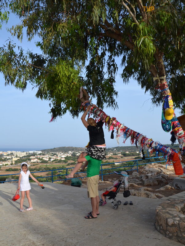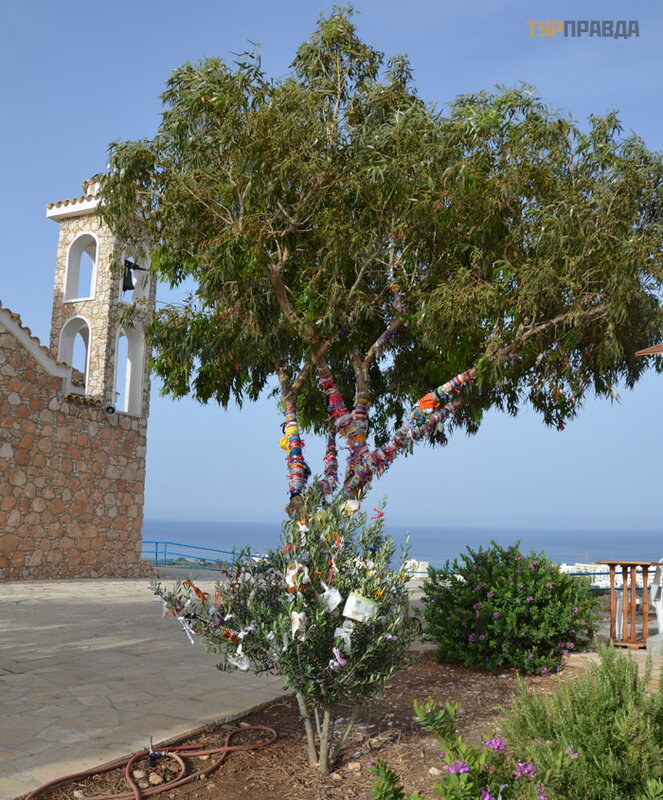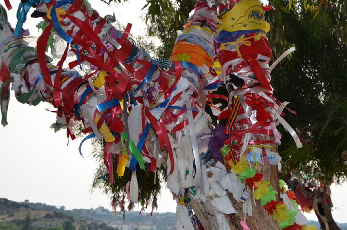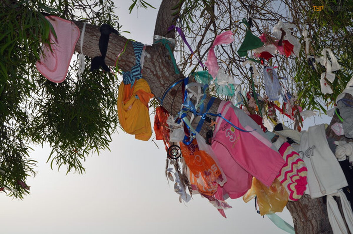 Ant kulno prie baž nyč ios auga medž iai, ant kurių ž monė s riš a. . . Norė č iau sakyti kaspinus, bet iš tikrų jų viskas, kas tik po ranka pasitaiko. Kad norai iš sipildytų . Nors č ia pat, baž nyč ios parduotuvė je, galite apsirū pinti juostelė mis po 50 euro centų . Sutikite, nebrangi kaina už norų iš sipildymą .