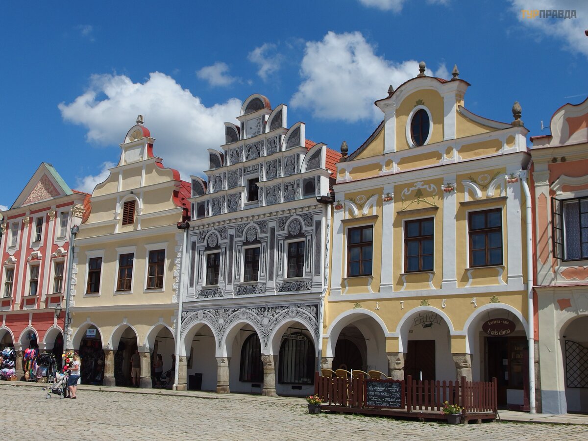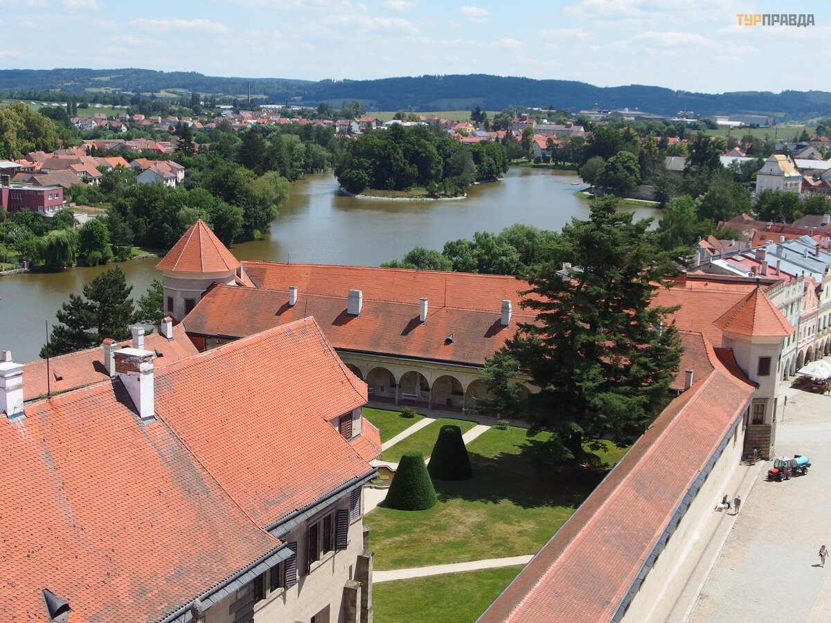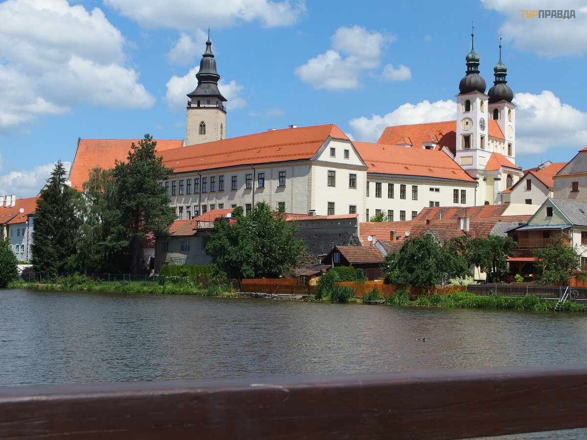 , jį (senamiestį ) iš visų pusių supa ež eras, upė ir gynybiniai kanalai. O graž ioji renesansinė Telč pilis atsispindi jų vandenyse.