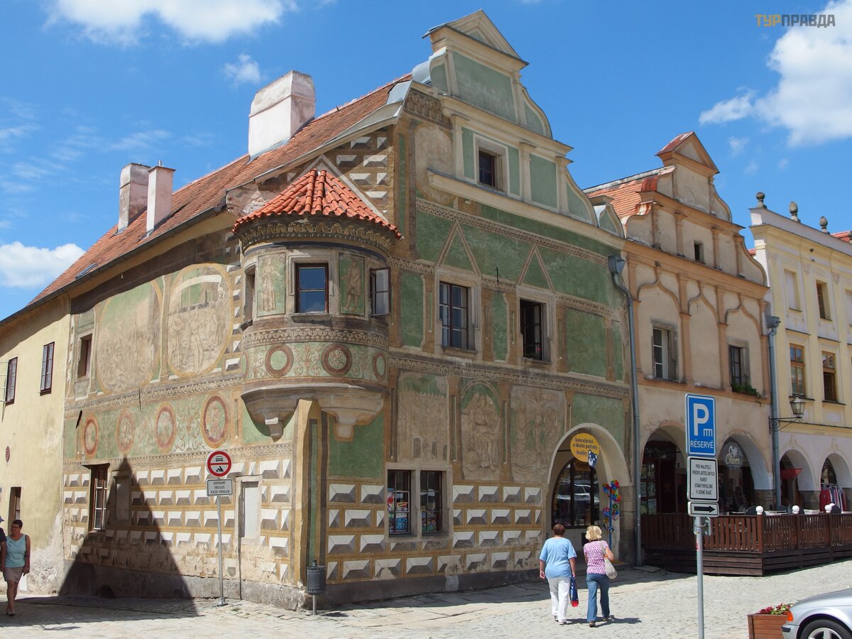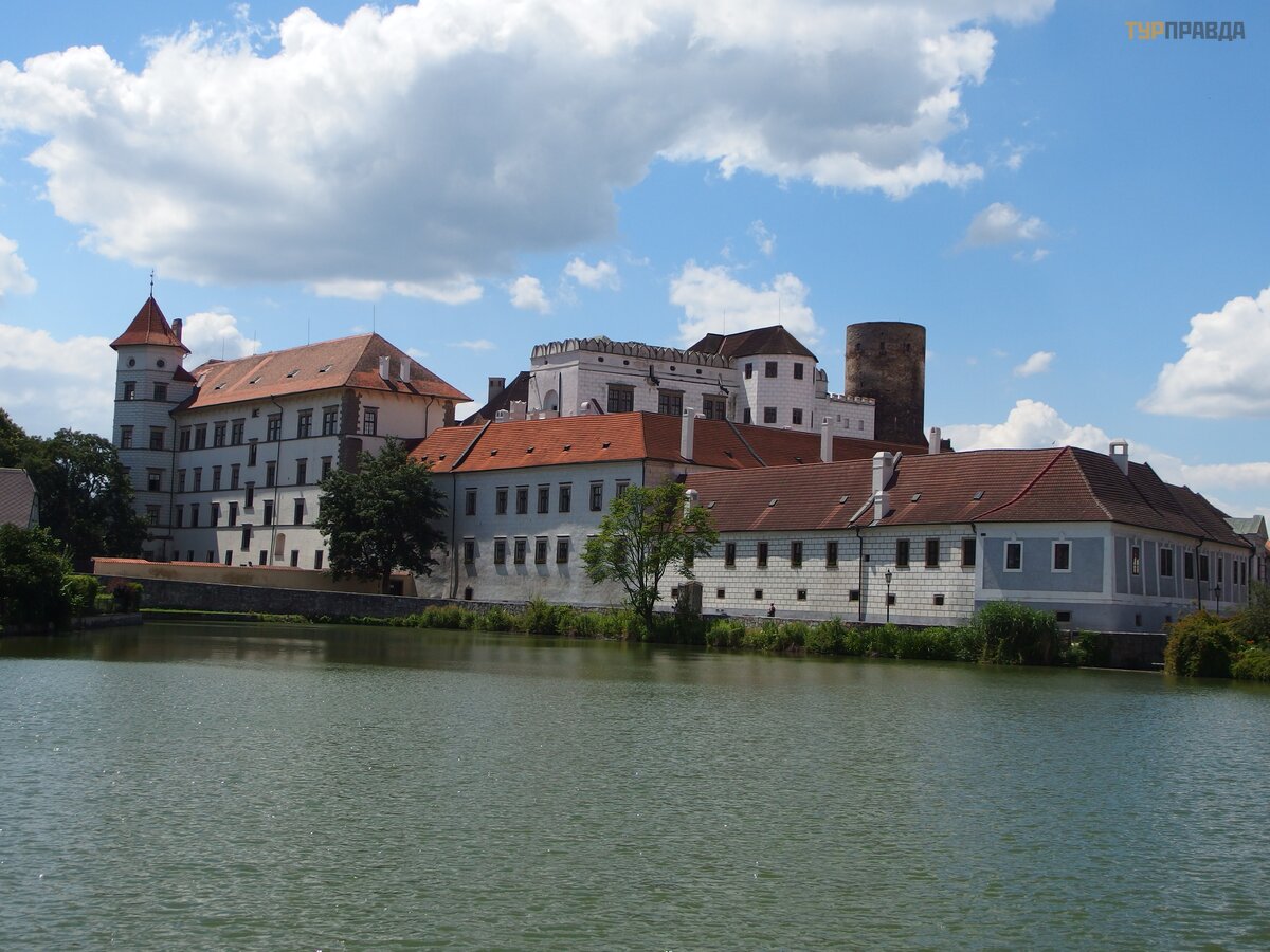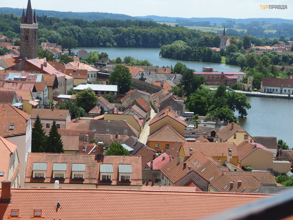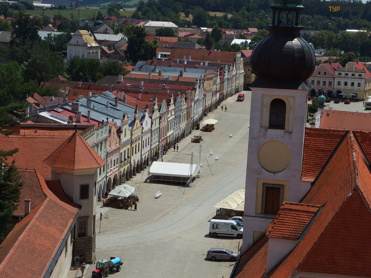 , jį (senamiestį ) iš visų pusių supa ež eras, upė ir gynybiniai kanalai. O graž ioji renesansinė Telč pilis atsispindi jų vandenyse.