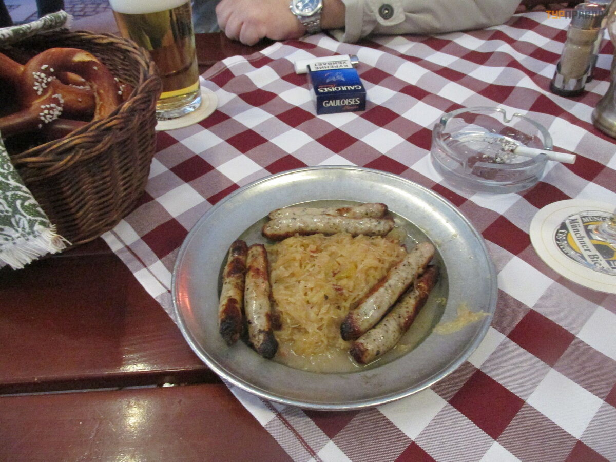Faktas tas, kad vokieč ių padavė jų akys nukreiptos į tuš č ių alaus bokalų paieš ką . Jie paima juos ir atneš a pilnus, neklausdami. Tač iau į tuš č ias vyno taures jie nereaguoja. O kad nelaukč iau, iš kart už sisakiau Frankfurter und Zwein vietinė s firmos vynmedž ių . – Cveinas? – paklausė padavė jas. "Taip. Zwein", - atsakiau. Ir atneš ė ne 2 stiklines, o du ą soč ius. Tai buvo š iek tiek daug, bet pakylė jo. Ir tada atneš ė.2 lė kš tes frankfurtieč ių . Ir už dengtas dviem. Tai jau buvo problema. 12 deš relių ir š ū snis troš kintų kopū stų . Bet aš nepasidaviau. Suvalgę s maisto ir vyno davinį , atsikė liau. Iš temptas. Apė jo aplink stalą , atsisė do prieš ais jį ir baigė antrą lė kš tę bei ą sotį . Padavė jai ir aplinkiniai vokieč iai labai susidomė ję ž iū rė jo į mane, bet man tai nerū pė jo. Jau patekau į psichotų deš imtuką , pasak vietos gyventojų atstovo. Tač iau eiti paskui tokį rijumą buvo nepakeliama. Netoli į ė jimo į alutę radau aikš tę su suolais ir atsisė dau. Tada atsigulk. Ir gulė jo ten apie valandą . Laimei, gulė jimas ant suoliuko Miunchene nė ra kaž kas neį prasto ir niekas manę s neerzino.