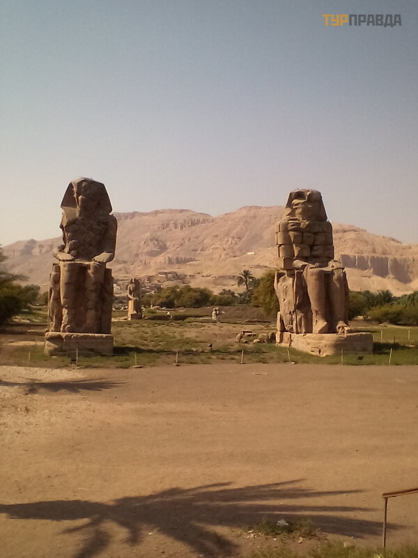 Kitas paž intinis objektas pakeliui – dainuojantys Memnono kolosai. Pavadinimas „Memnono kolosas“ yra graikiš kas ir neturi nieko bendra su senovė s egiptieč iais. Kolosai senovė s pasaulyje iš garsė jo po ž emė s drebė jimo 27 metais prieš Kristų , kai š iaurinė statula buvo smarkiai apgadinta – nukrito visa virš utinė dalis. O po to vietoje likusi apatinė dalis pradė jo skleisti garsus. Kadangi garsas buvo girdimas auš tant, graikai statulas vadino „Memnono kolosais“. Memnonas – Etiopų karalius, atvykę s su kariuomene padė ti apginti Troją . Memnonas buvo Eoso, auš ros deivė s, sū nus. Pasak graikų legendos, ryto rasa yra Eoso aš aros už mirusį sū nų . O garsus iš Kolosų ryte graikai laikė deivė s Eos š auksmu savo mirusio sū naus.