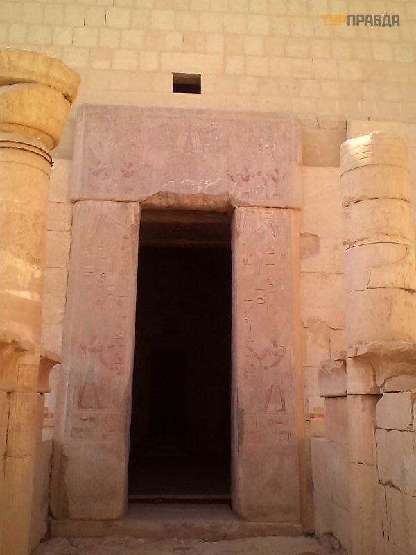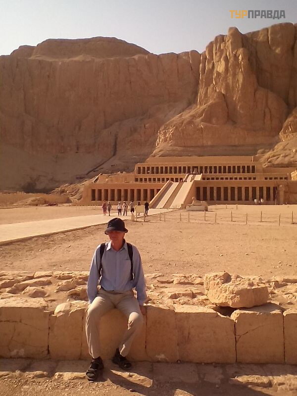 Keturią valandą popiet buvo nepakeliamas karš tis, todė l turime dar vieną ekskursijos objektą – Karalienė s Hač epsutos š ventyklą . Atrodo kaip perdarymas, nes jį restauravo vokieč ių architektai. Bet verta paž iū rė ti. Hač epsutos š ventykla yra visiš kai naujas statybos stilius senovė s Egipte, o jos monumentalią iš vaizdą naudojo daugelis architektų visame pasaulyje.