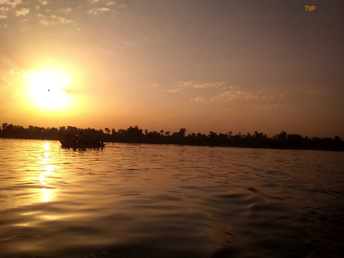 Ekskursijos pabaigoje plaukiame laivu per Nilą į prieš ingą krantą iki autobusų stotelė s. Saulė lydis nuostabus,