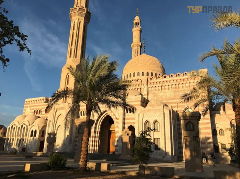 Первая остановка - Мечеть Эль-Мустафа. Осматривать можно только снаружи. Вход вовнутрь запрещен. На момент нашего посещения в связи с карантином мечеть была закрыта, открывается только во время молитвы.