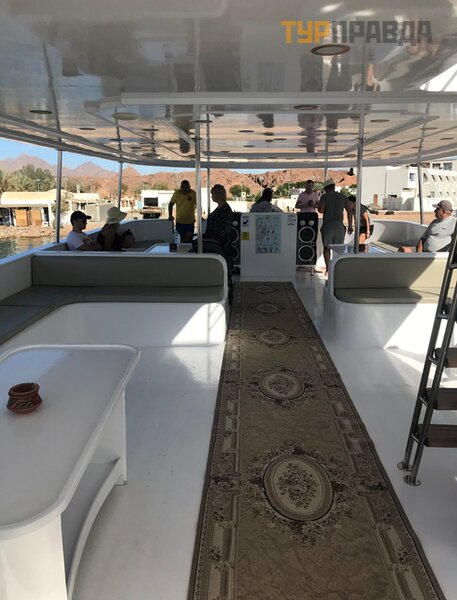 При входе на яхту нас ждал первый сюрприз: обязательно нужно снимать обувь. Наверное, в другое время года это воспринималось бы нормально, но сейчас пол на палубе местами был холодным, поэтому в выигрыше оказались туристы, взявшие с собой носки или дополнительную пару обуви (в том числе для плавания).