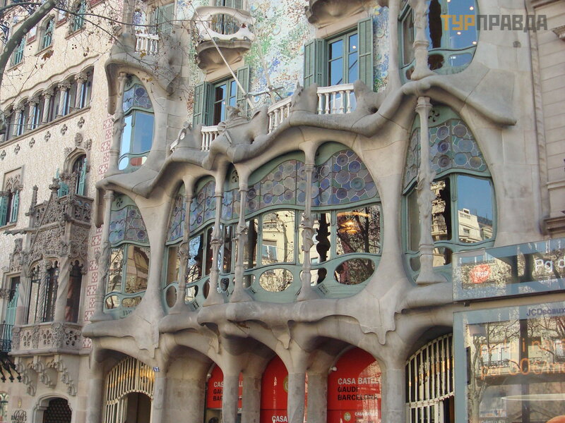 , созданных Антониа Гауди. Его творения не укладаваются в привычные рамки, его девиз – нет прямым линиям. Смотрим дом Бальо с многоцветными стеклами и керамической облицовкой,