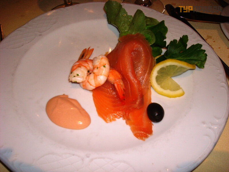Вот такие блюда в ресторане. Красная рыба, украшена креветкой