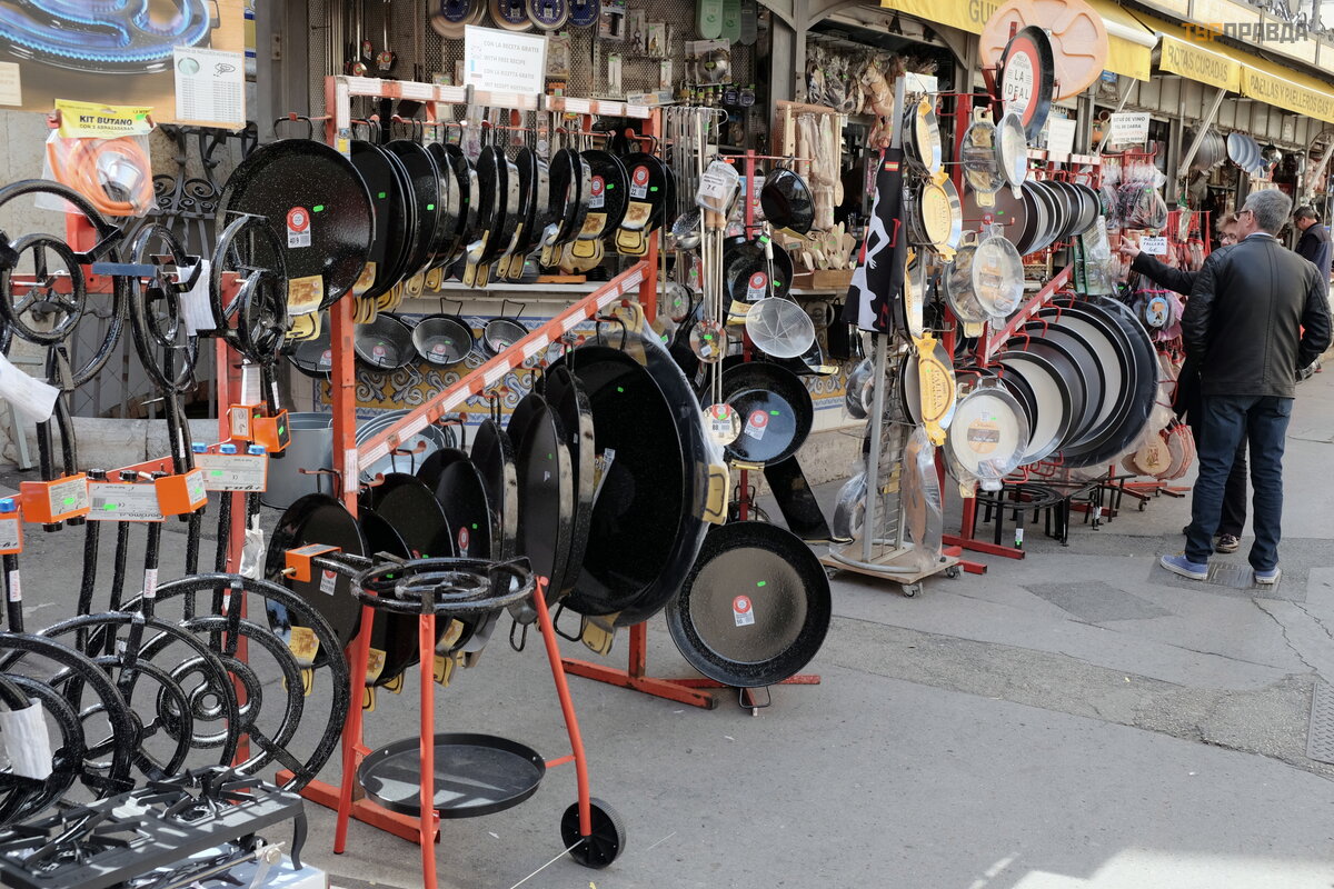 Prie į ė jimo parduodamos „Paella“ keptuvė s (iš karto prisiminiau istoriją iš interneto, kur ispanas juokdamasis pasakoja, kaip jū roje plaudavo keptuves)