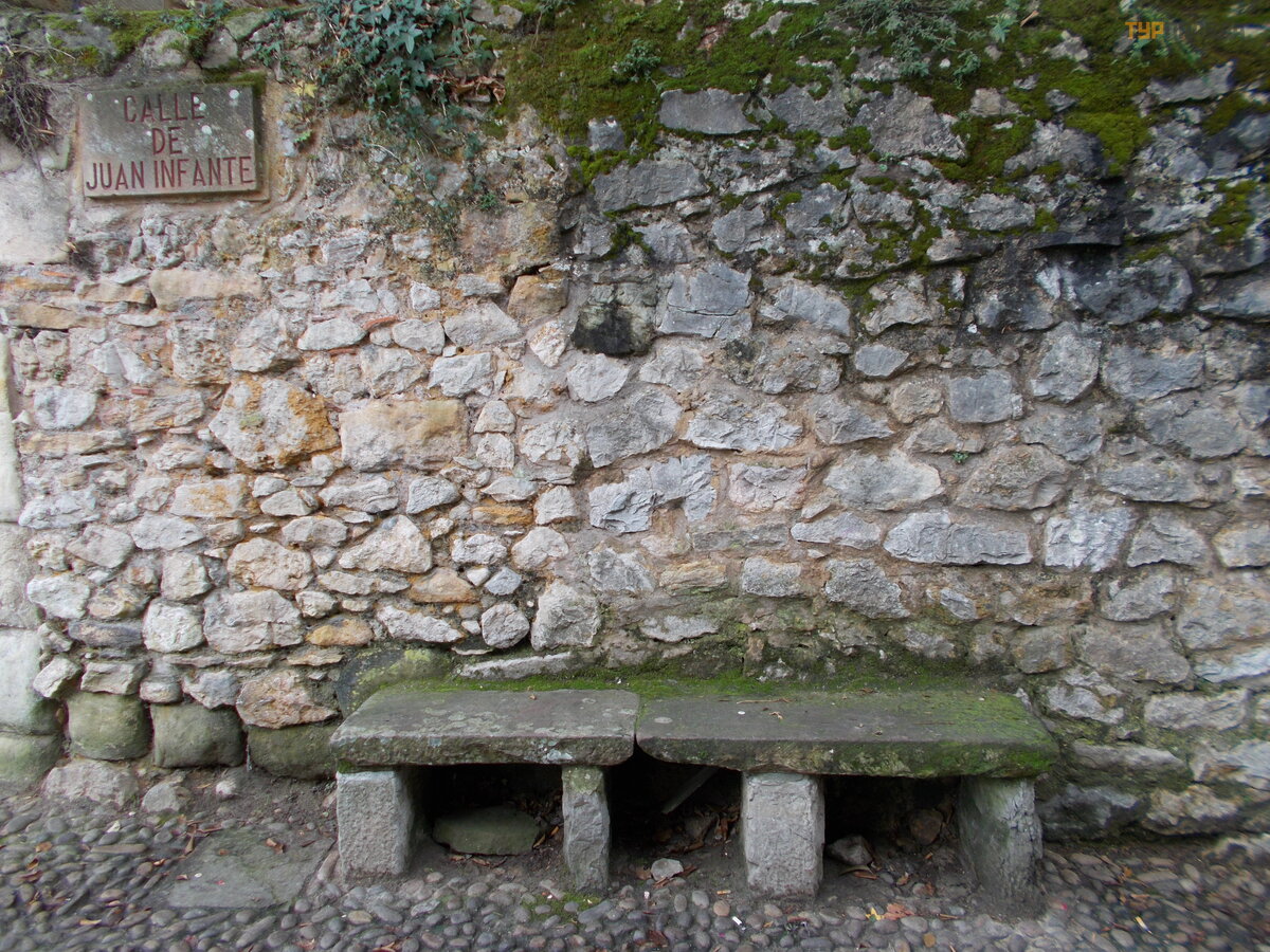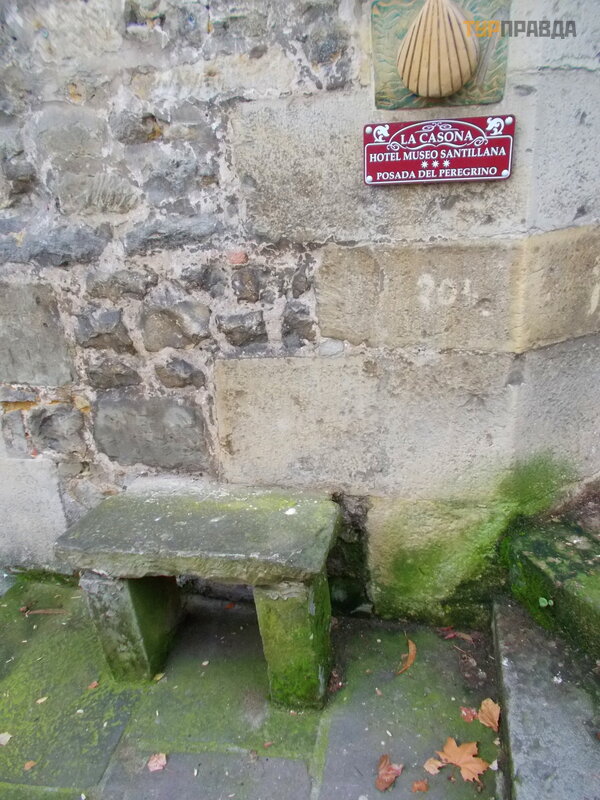 Pavargus galima atsisė sti ant patogaus akmeninio suoliuko – viduramž ių aidas. Emblema ant sienos kriauklė s pavidalu reiš kia, kad per Santillana del Mar kaimą eina garsusis Europoje piligrimų kelias – Š v. Jokū bo kelias. Todė l jei esate tikintysis ar tiesiog domitė s istorija ir norite pasivaikš č ioti š iuo garsiuoju piligriminiu keliu, nepamirš kite pagerbti evoliucijos teorijos ir valandai pasiž valgyti į Altamirą .