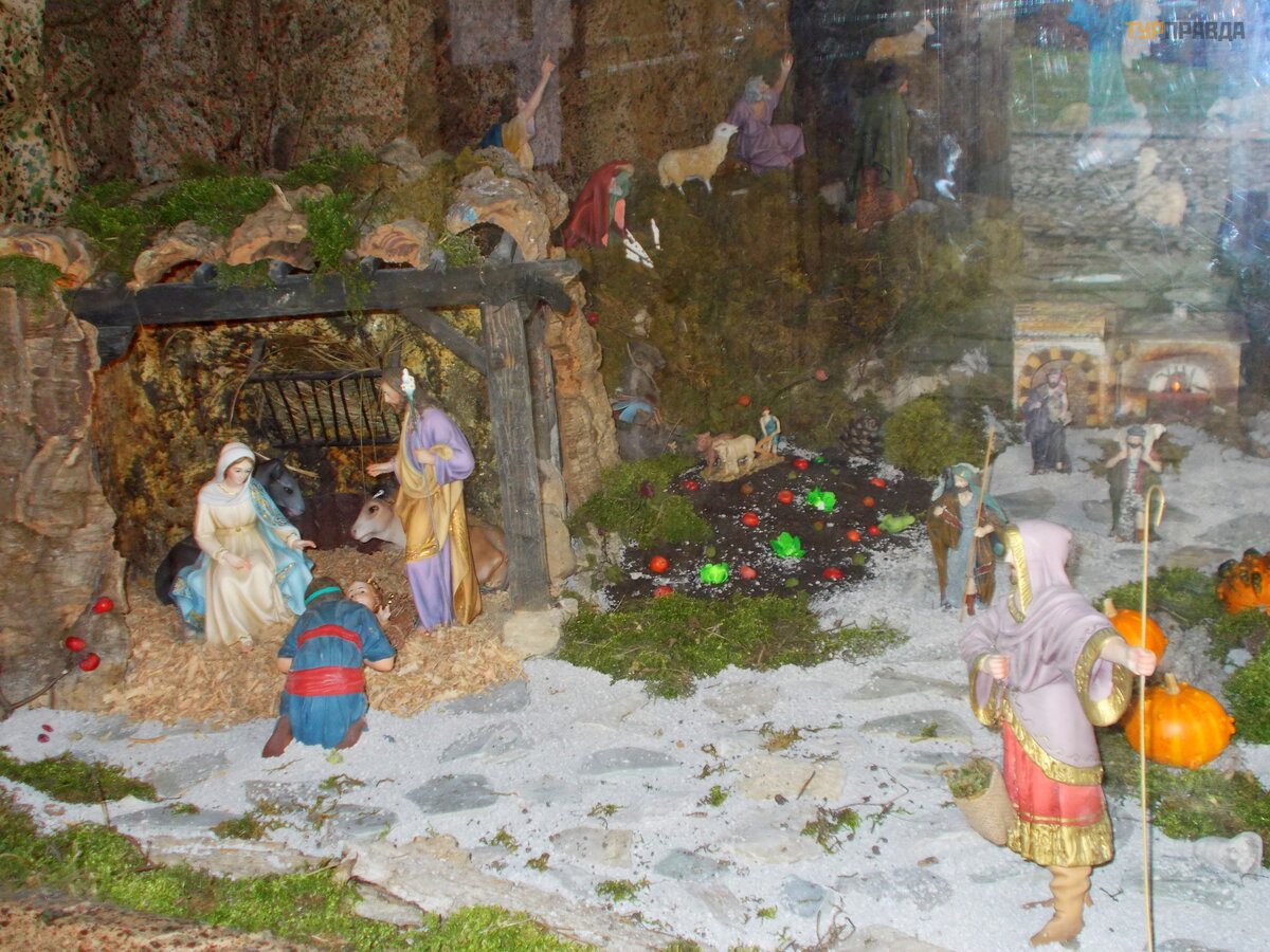 Ir ž inoma - Linksmų Kalė dų ! Už stiklinių vitrinų yra figū rė lė s, vaizduojanč ios Evangelijos scenas.