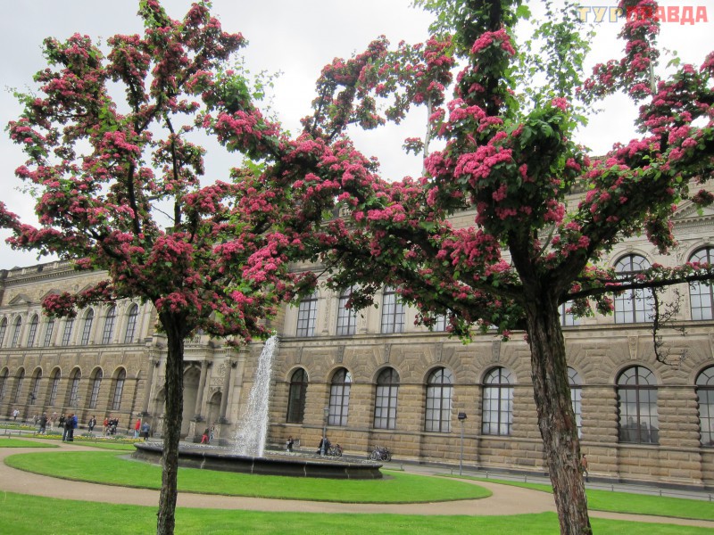Это фото Дрезденской картинной галереи со стороны Театральной площади. Цветет розовый боярышник
