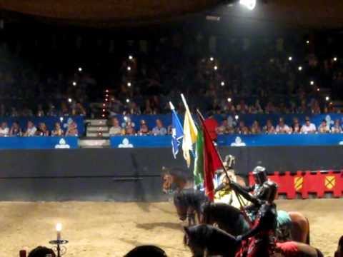 Первая часть состоит из самого турнира : зал поделен на 4 сектора 4-х цветов (ряды с накрытыми столами (вода, вино)). Посередине- арена, где рыцари сражаются за честь короля. Каждый сектор «болеет» за своего рыцаря-