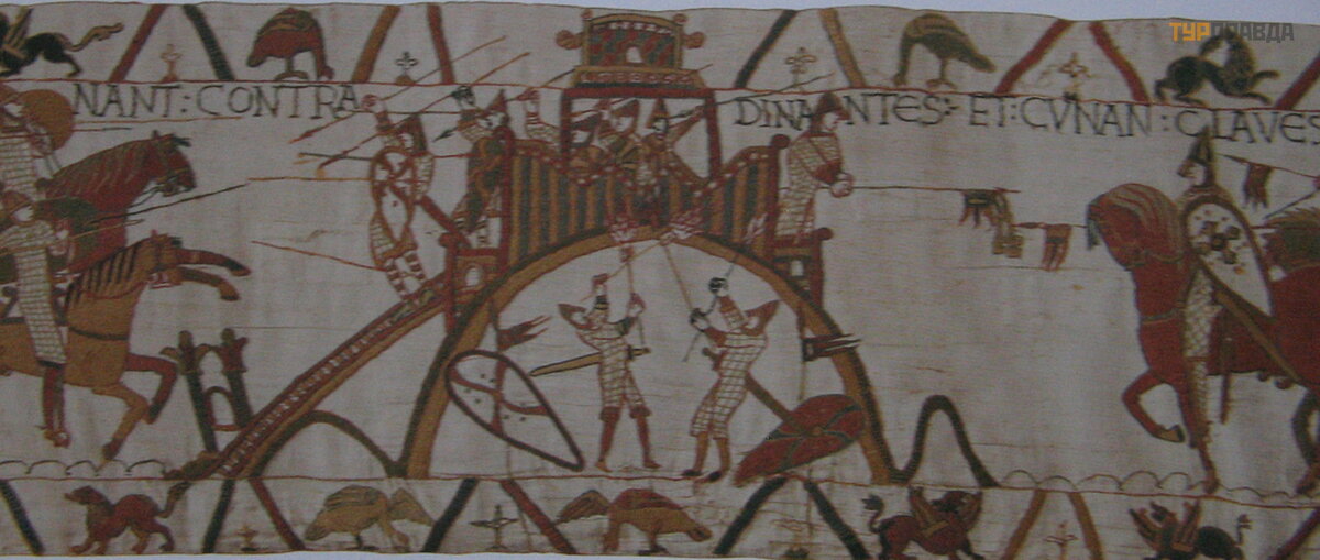 scena iš kilimo Bayeux mieste (vienas iš Dinano valdovų perduoda miesto raktai Vilhelmui)