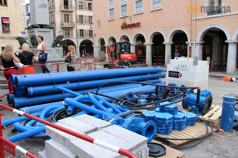 А купить все это можно в супермаркете в центре Анси, на площади Нотр Дам напртив фонтана со львами. Вот специально выкладываю фотку, где видно вход в этот магазин « Monoprix». На 1 этаже расположены галантерейные отделы, а продукты на 2 этаже, но вход туда так завуалирован, что если никогда не был, то не найдешь. В общем, нужно зайти в магазин, пройти прямо вдоль первой секции, потом свернуть налево и вы увидите эскалатор, на котором нужно подняться в продуктовый отдел. Специально выкладываю фотку с видом на супермаркет (возле памятника "женщина в белом" -это наш гид Елена).