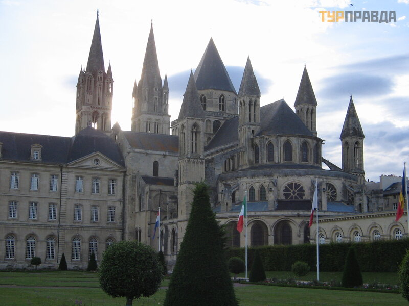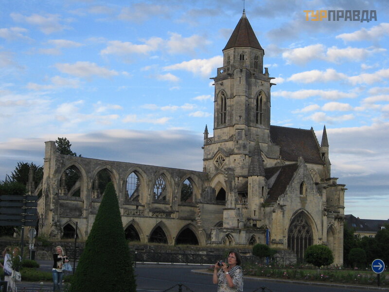 Церковь Св. Троицы (сейчас приходская Св. Жиля) находится в женском монастыре (восточнее крепости), основанном герцогиней Фландрской Матильдой – женой Вильгельма. Она умерла немного раньше Вильгельма и похоронена в основанном ею аббатстве. Ее могила находится под плитой из черного мрамора. Женский бенедиктинский монастырь находился здесь до революции. При нем учились девочки из знатных семей. Самая известная – Шарлотта Корде, убившая Марата. На территории аббатства сейчас находятся органы местного самоуправления, поэтому сюда можно попасть в ограниченный промежуток времени с экскурсией в фиксированное время.