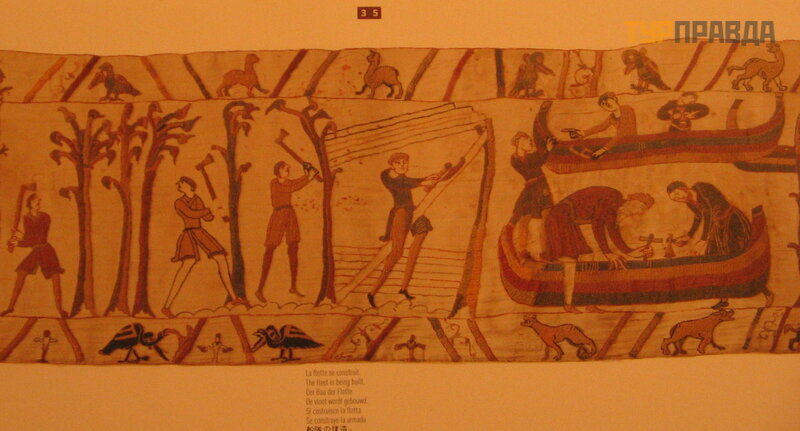 Baž nyč ia pastatyta pagal tipiš ko turgaus modelį (kaip Etretato turgus), kuris savo ruož tu primena apverstą laivą . Tam yra dvi priež astys: 1) pač ios pirmosios krikš č ionių baž nyč ios buvo Nojaus arkos priminimas; 2) Normandijos baž nyč ios daž nai buvo medinė s, o statytojai buvo prie š io modelio pripratę laivų statytojai. Tokias konstrukcijas jie statė nenaudodami pjū klo, tik su kirviais. Maž daug taip, kaip pavaizduota ant Bayeux kilimo.
