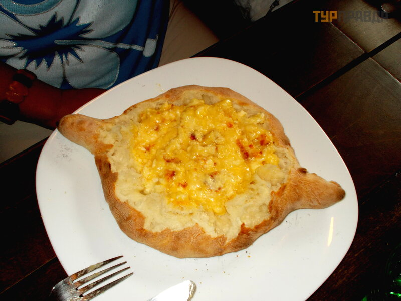 Ir tada buvo Batumis. . . Jis mus pasitiko su geriausiu savo pasiekimu (kaip mums atrodė , alkanas ir suš alę s) – Adjarijos chač apuri, jie yra adzaruli (7 lariai už patiekalą ). Neturė jau laiko į amž inti paties grož io, nes aromatas mane tiesiog iš vedė iš proto, o kai atė jau į protą , dingo pagrindinė š io patiekalo savybė – kiauš inis, kuris dedamas pač iame š io garduko viduryje. , jau spė jo sumaiš yti su į daru. Bet vis tiek atrodo atpaž į stama. Nuoš irdž iai prisipaž insiu, aš to neį valdž iau, ir tai tik maž iausia dalis). Sklando legendos apie Gruzijos didvyrius, kurie vienu prisė dimu gali į valdyti dalį Titaniko. . .