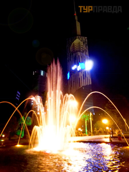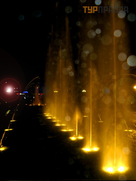 Kai nusileidome ž emyn, miestas jau degė š viesas. Siaurose senamiesč io gatvelė se dieną gali susidaryti spū stys, tač iau vakare jos labai palankios vaikš č ioti pė sč iomis. Nutarė me susitikti 21 valandą Piazza, tai irgi yra itališ kas kiemas, kuriame yra modernus laikrodž io bokš tas ir tautiniais kostiumais pasipuoš usios figū rė lė s. Tada pasukome į jū rų uostą , kad nuvyktume į Bulvarą – turistų ir miestieč ių mė gstamą atostogų vietą . O š viesų vis daugė jo. . . Man asmeniš kai ryš kiausius į spū dž ius paliko garsieji dainuojantys fontanai: stebė tinai priderinti vandens č iurkš lių š okiai prie malonios klasikinė s ir nelabai muzikos). Mū sų ž ygio pabaiga buvo aikš tė su Medė jos su Aukso vilna statula, kur kupini į spū dž ių sė dome į automobilį ir patraukė me į sveč ių namus.