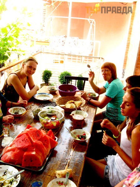 Nebuvo kaip praleisti pietų , nes nakvynė s namų š eimininkė mums paruoš ė tikrą chač ą , o jos vyras atneš ė "nelabai saldaus, dar tik prasidė jo" arbū zo. Bijau į sivaizduoti, koks arbū zų skonis pač iame sezono metu)))), nes š is, „nesezoninis“, mū siš kiai bū tų pranaš esni 100 taš kų !