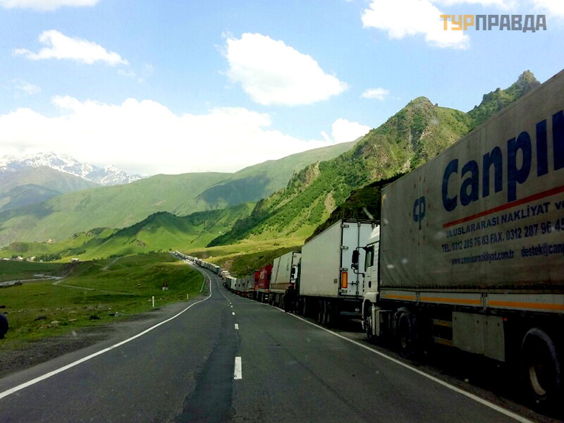 Kelis kartus teko sustoti pakeliui fotosesijai, paskui apsipirkti (nepraleidau progos į sigyti man taip patikusio tlapi), todė l Gruzijos sieną pravaž iavome apie 15. Š tai ir buvome bė doje – neutralioje zonoje susidarė solidus spū stis nuo automobilių , kurių ilgis siekia beveik du kilometrus. Jau prie rusiš ko už tvaro, kai mū sų kantrybė jau beveik baigė si, suž inojome, kad po 2 valandų , pravaž iavus Kazbeką , ten nusirito purvas ir eismas buvo paralyž iuotas. Pasisekė ir č ia) po tokių ž inių net apsidž iaugė me, kad tuo metu buvome prie Rusijos sienos. Nepaisant to, 18:00 į važ iavome į Rusijos Federacijos teritoriją .