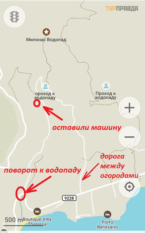 Kita mū sų kelionė s stotelė buvo Mylono krioklys. Važ iuojant link jo, svarbiausia nepraleisti posū kio, jis toks nepastebimas. Apraš ymuose raš oma apie „specialų asfaltuotą taką “, bet „asfalto“ neradome. Nes vaziavome is Orino, navigatorius mus vede artimiausiu keliu. Paaiš kė jo, kad tai kelias tarp darž ų . Vyras pasakė , kad automobilis, nors ir ne jo, nesiruoš ia jos nuž udyti, apsisuko. Nuvaž iavome į kitą posū kį , ten yra ž enklas, matyt, č ia tas pats „asfaltas“, bet be asfalto. Dė l to pė sč ių jų tako pradž ios nepasiekė me, automobilį palikome ten, kur kelias platesnis.