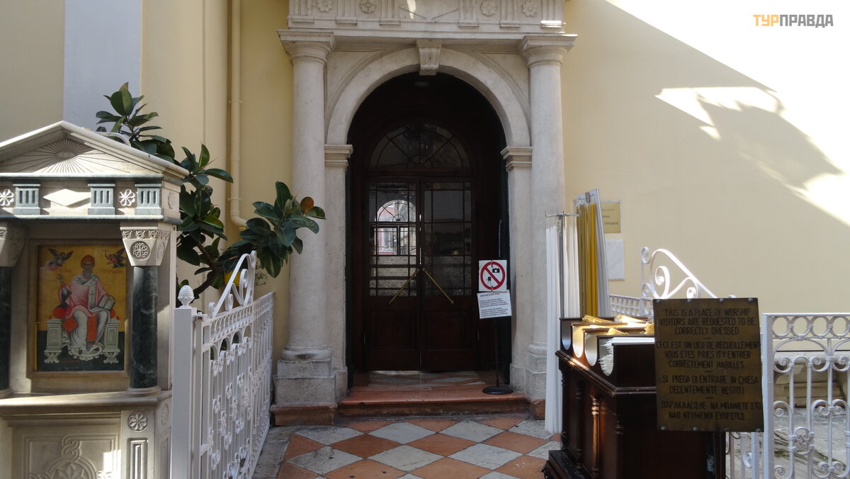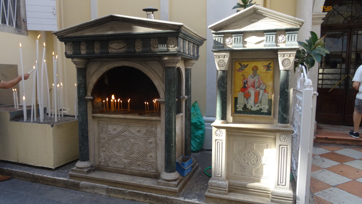 Ir dabar siauroje gatvelė je prieš mus iš kilo Š v. Spiridono baž nyč ia.