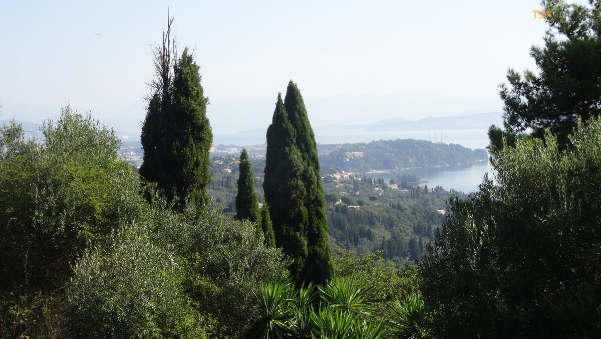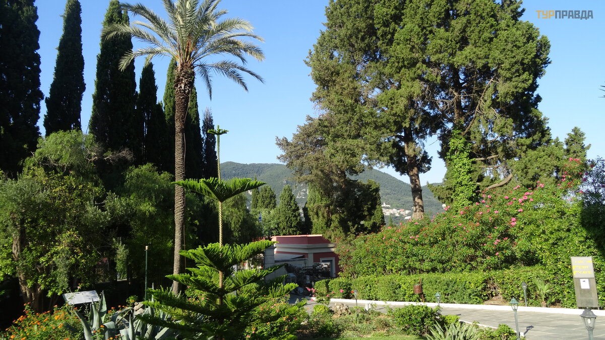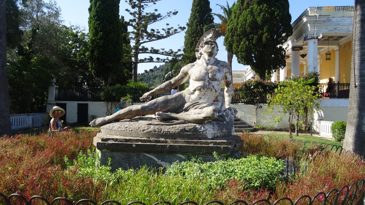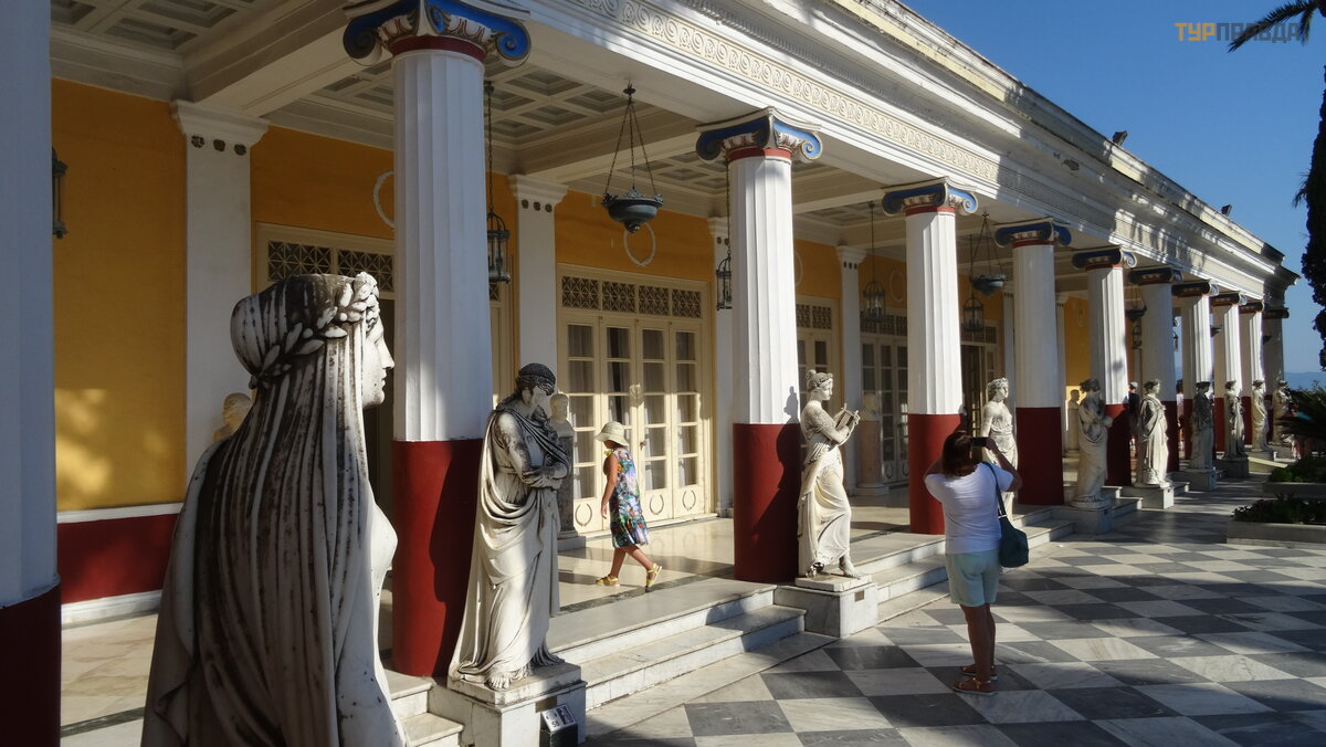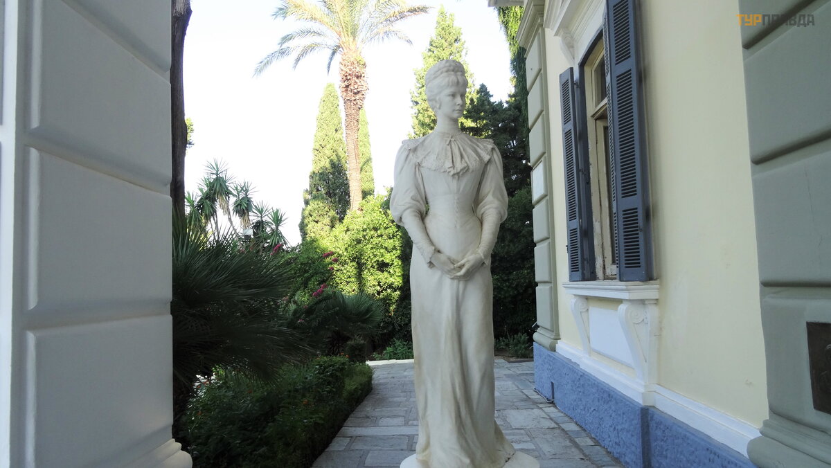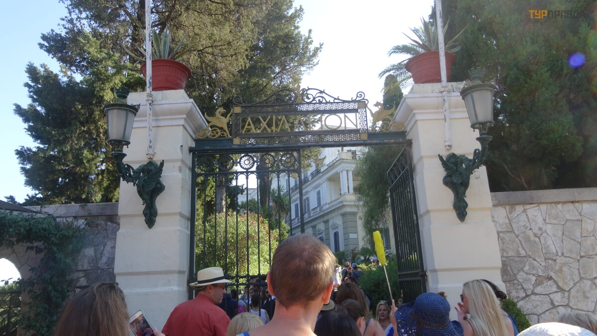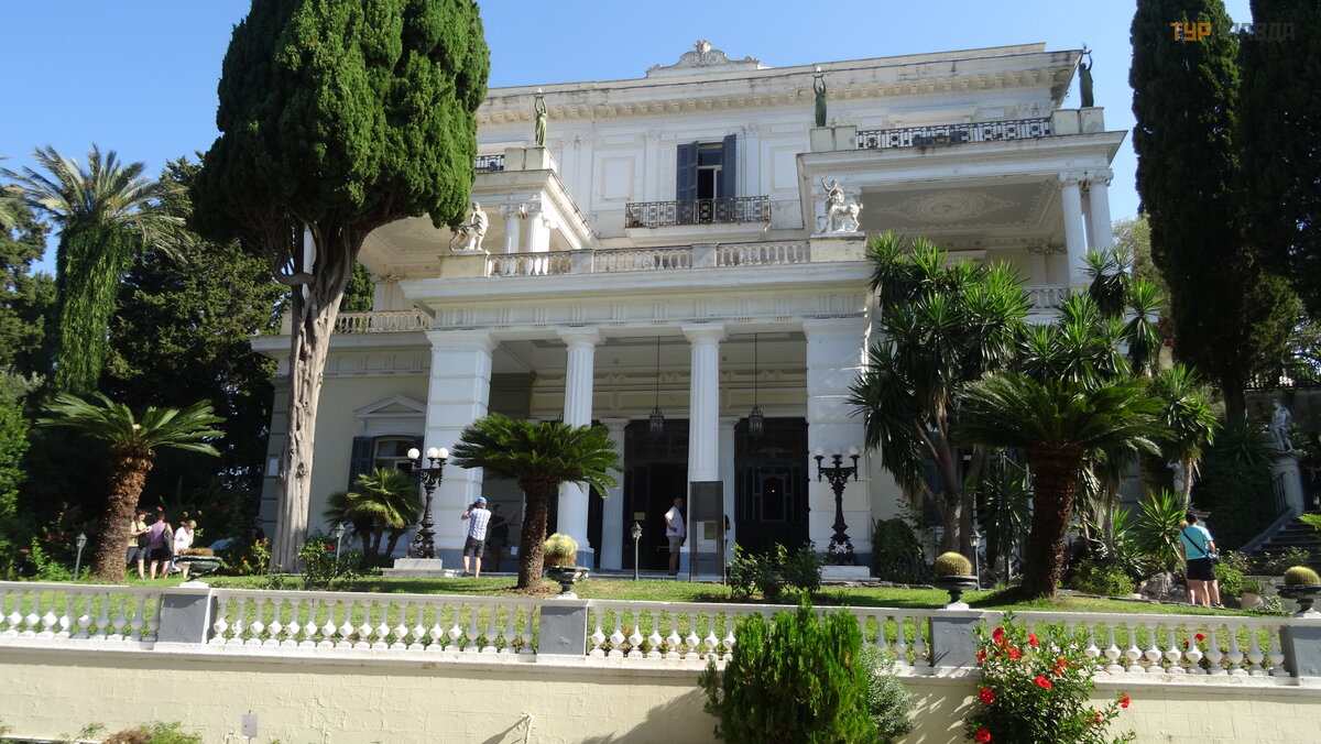 Jie vis dar miega, bet aš bė gu link salos ir pirmoji stotelė buvo Achiliono rū mai, imperatorienė s Sisi vasaros rezidencija.