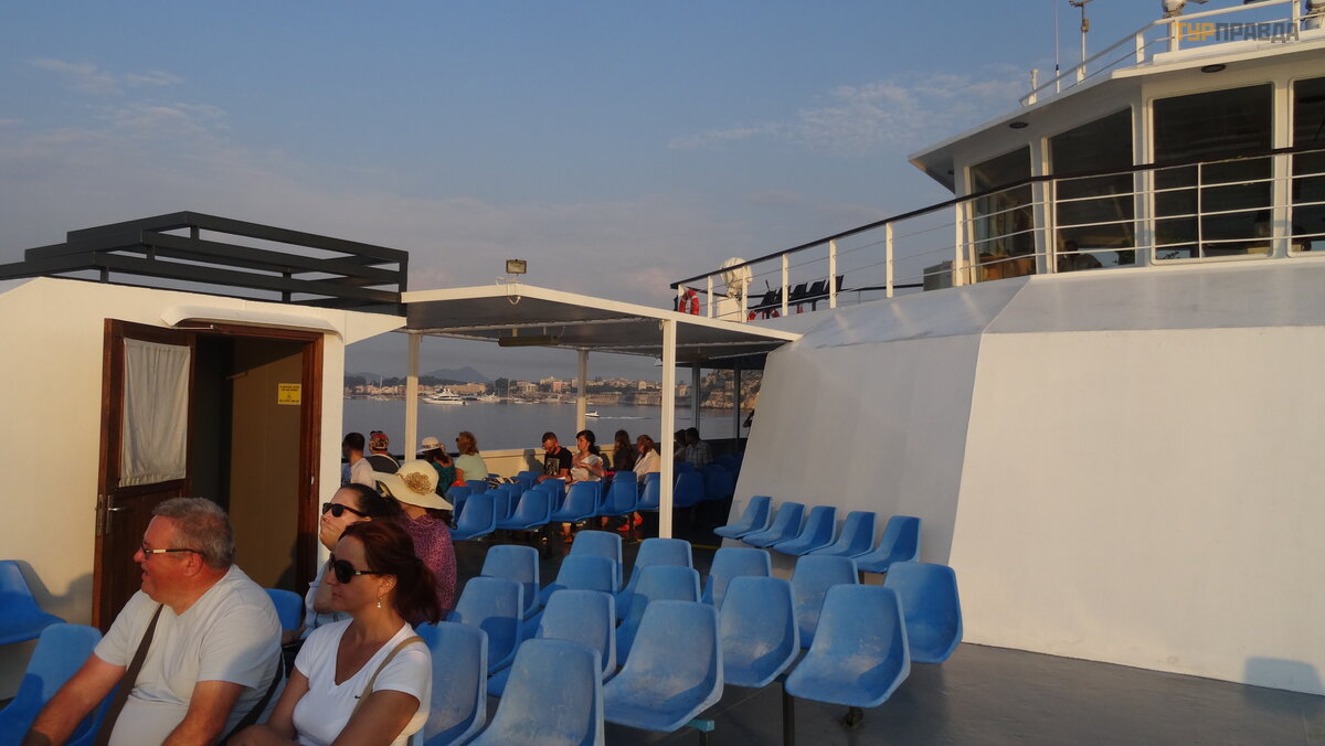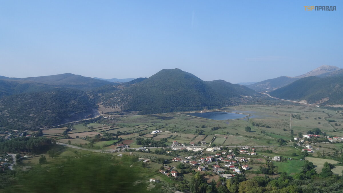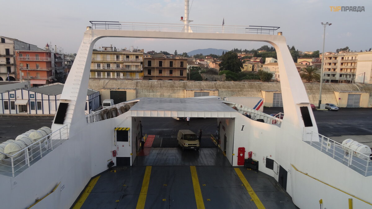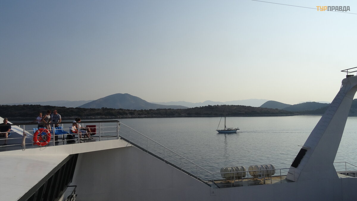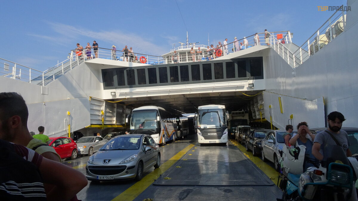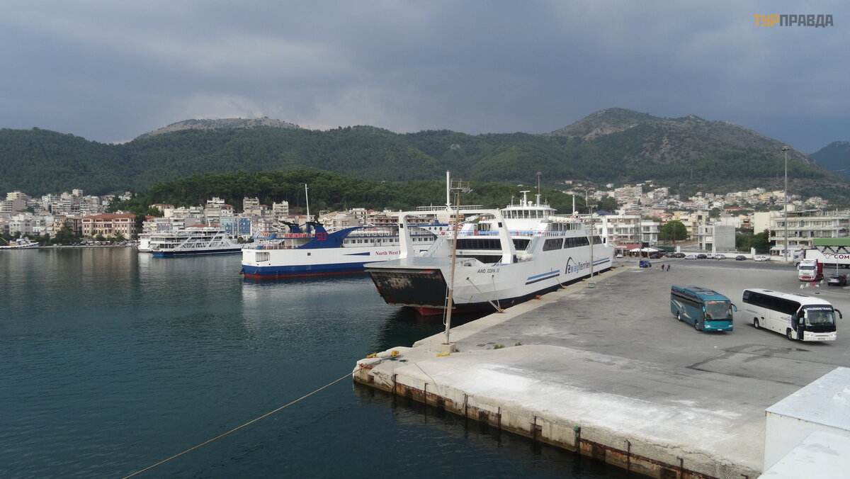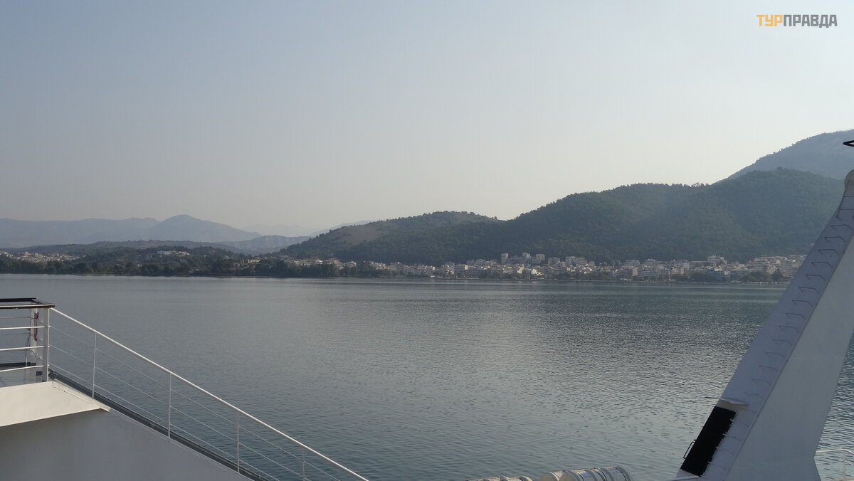 Ir dabar horizonte pasirodė neryš kus kontū ras, tai yra Igumenicos uostas. Prisiš vartavę prie kranto, iš lipome iš kelto, į sė dome į autobusą ir, pasakodami į domius gido pasakojimus, iš keliavome už kariauti ž emyno.