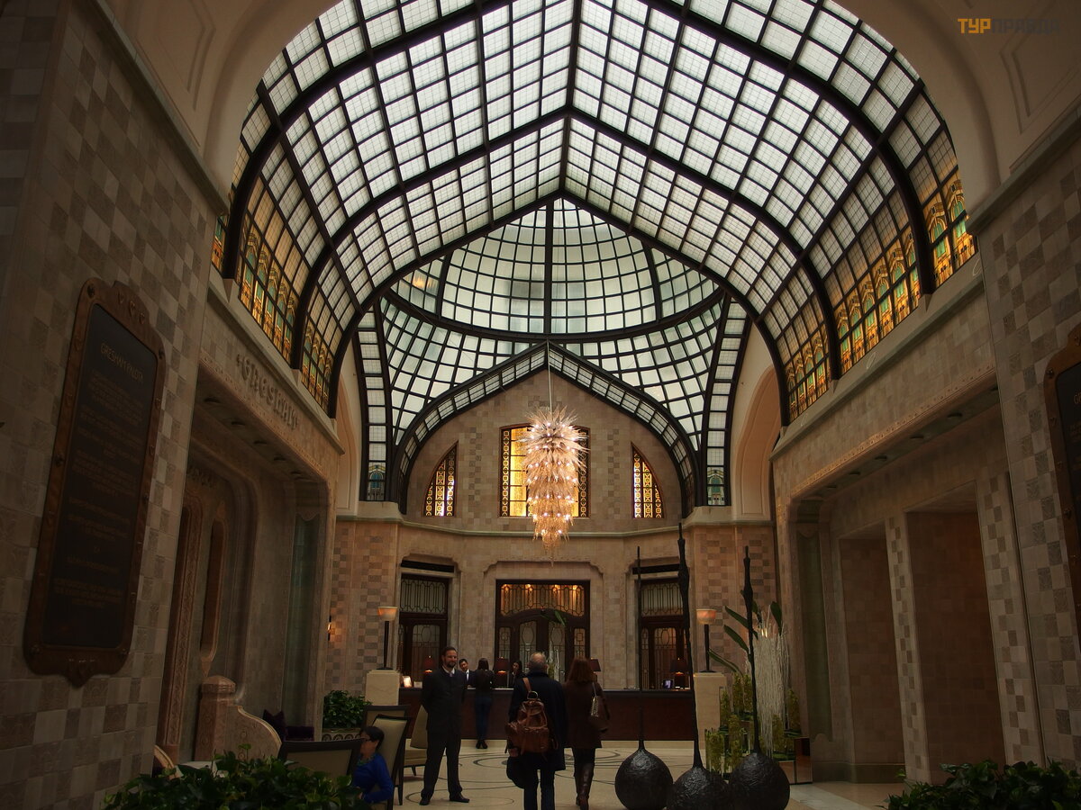 Первый этаж дворца Грэшема выполнен в виде буквы «Т» и имеет арочную галерею с прозрачной крышей. В ней располагались несколько магазинов и ресторан, предлагающий попробовать изысканные венгерские блюда. За удобными столиками собирались члены «кружка Грэшема» – закрытого клуба венгерской творческой интеллигенции. Такого рода пассаж был единственным в Будапеште, и все дамы из высшего общества предпочитали делать покупки именно здесь. Дворец Грэшема в Венгрии считался самым модным местом. В здании имеются три основные лестницы, которые были названы в честь графа Дьюлы Андраши, Томаса Грэшема и Лайоша Кошута. В промежутках лестничных клеток горели ярким светом огромные витражные окна, в центре которых красовались портреты этих выдающихся людей. Кстати, эти витражи являются работой гениального Микши Рота.