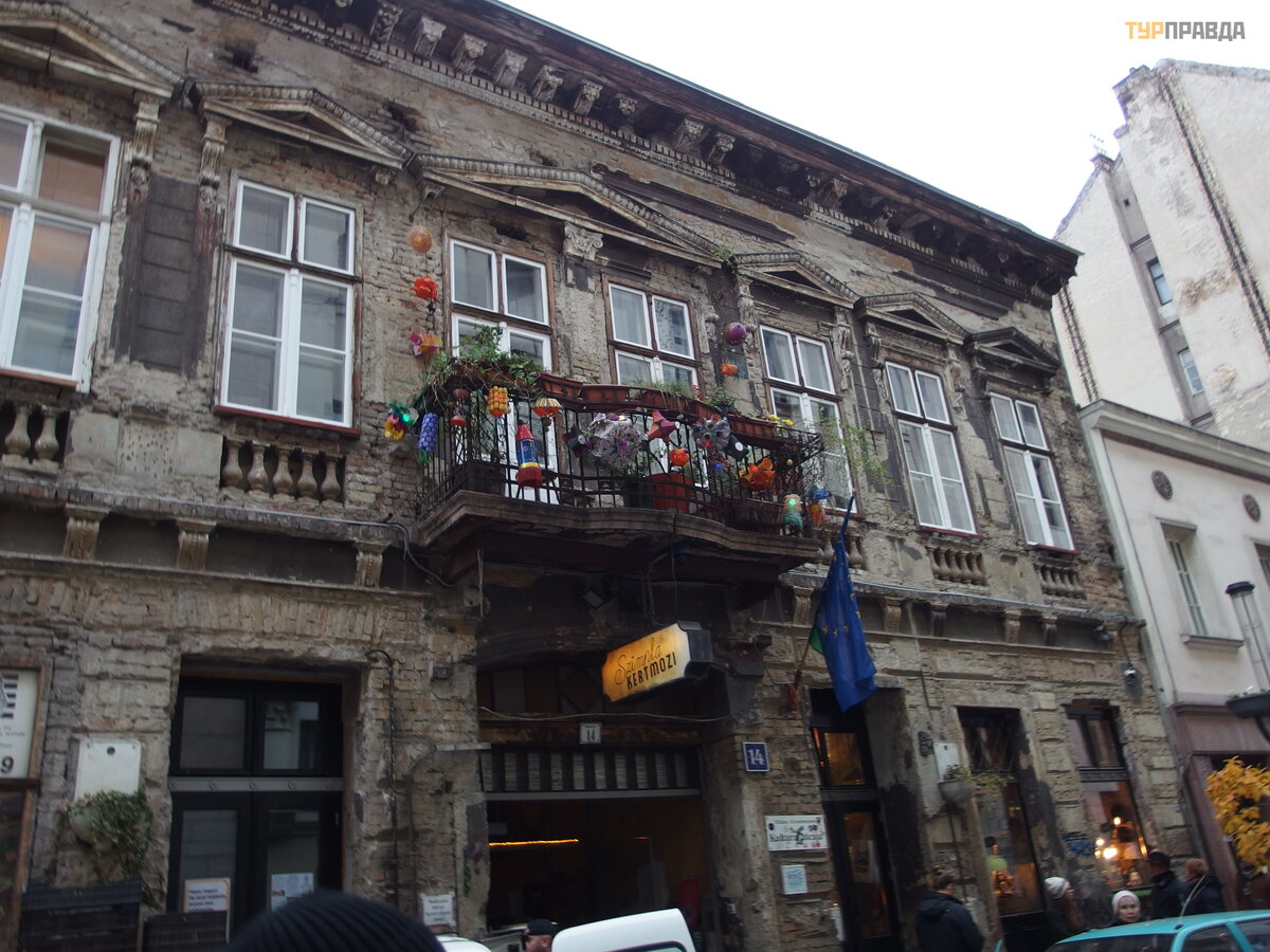 Во время Второй Мировой войны в этом районе было образовано гетто, куда свезли 70 000 евреев для последующей отправки в лагеря смерти. 2000 домов были огорожены стеной и помечены желтыми звездами. После войны многие жители покинули этот район. И он оставался заброшенным до 2000-х годов. Городские власти планировали снести эти постройки, но неожиданно оказалось, что место не пустое , а совсем даже наоборот востребованное. Несколько креативных молодых людей с ограниченными финансовыми возможностями выкупили старое здание и создали в нем необычный интерьер. В ход пошла старая мебель, книги, игрушки, вывески, одежда , в общем всякий хлам с мусорки : ))) И так зародилось целое течение руин-пабов, которое впоследствии стало визитной карточкой Будапешта. И позволило сберечь целый станинный район города.