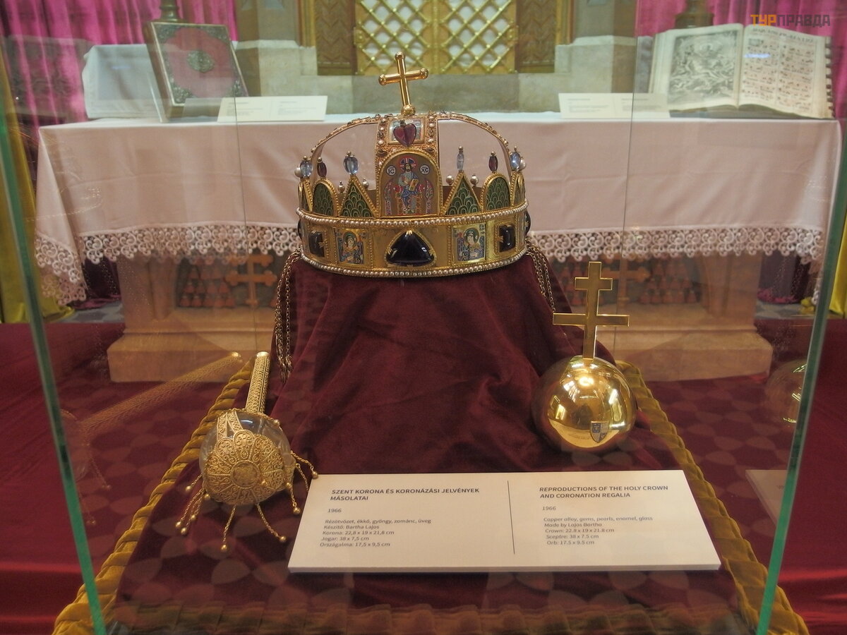 Baž nyč ioje saugomas Vengrijos monarchijos simbolis – karū nos, naudotos karaliams karū nuoti, kopija. Joje buvo laikomos miš ios naujų valdovų karū navimo garbei (patys karū nacijos vyko Szekesfehervare), 1867 metais č ia buvo karū nuotas Pranciš kus Juozapas ir jo ž mona Elisabeth (Sissi), o 1916 metais - Karolis IV ir Zita iš Parmos. Habsburgų dinastijos.