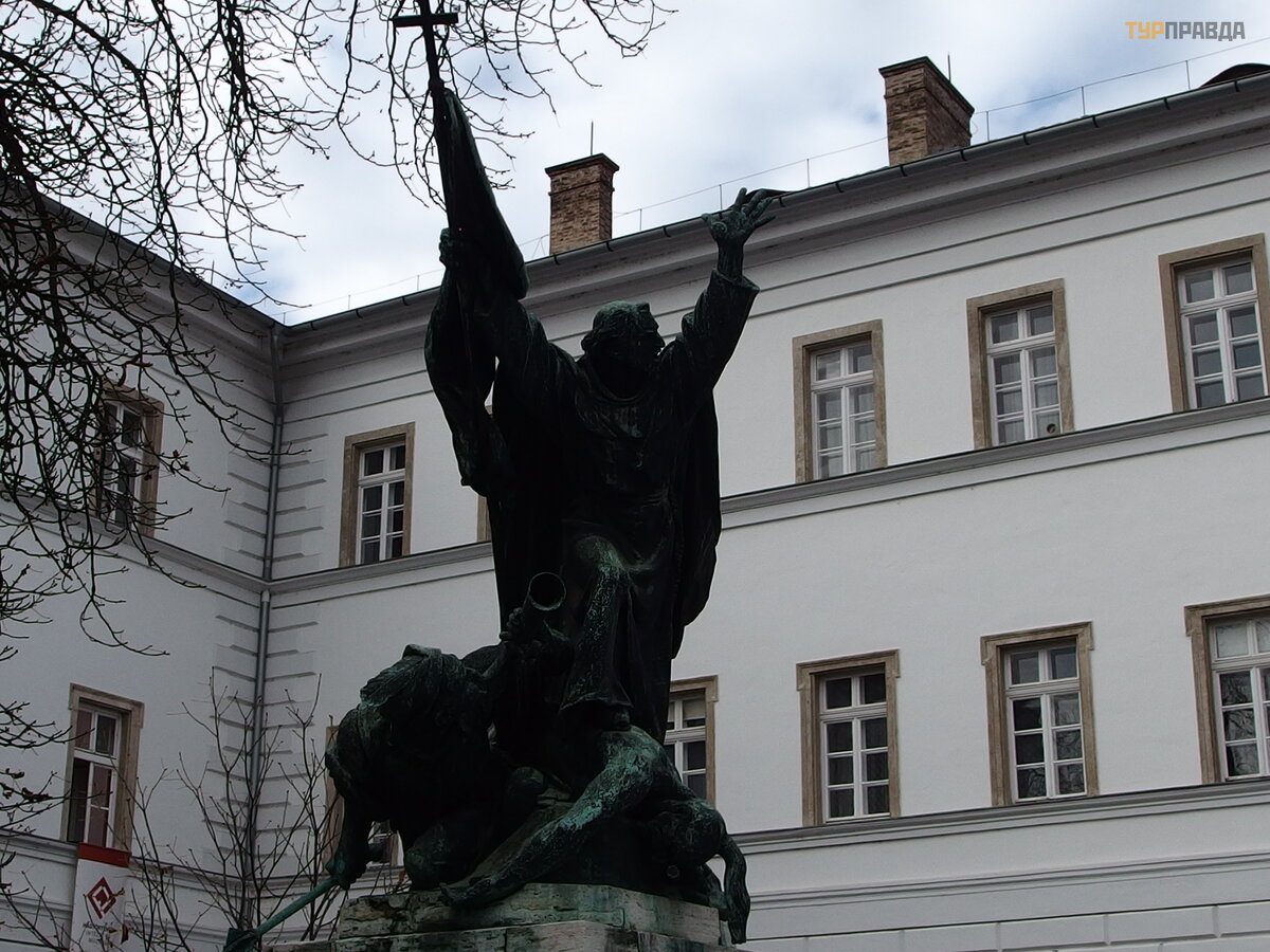Если пройти вдоль здания архива влево, то можно выйти на площадь Капистрано (Kapisztrá n té r) названной в честь итальянского францисканца Джованни (Яноша) Капистрано (1386-1456), монаха-проповедника, сумевшего собрать армию против турок. Здесь же стоит очень интересный памятник этому монаху, стоящего одной ногой на теле убитого турка.
