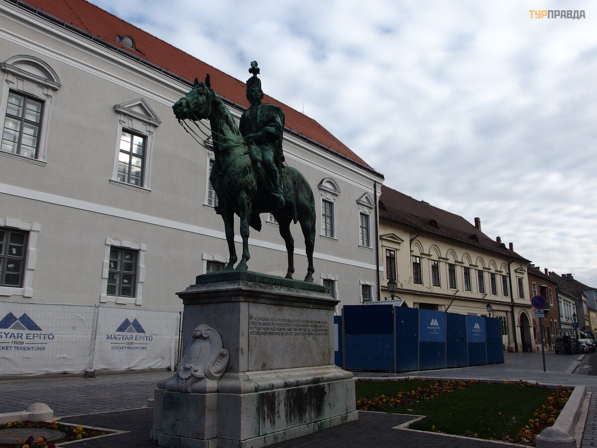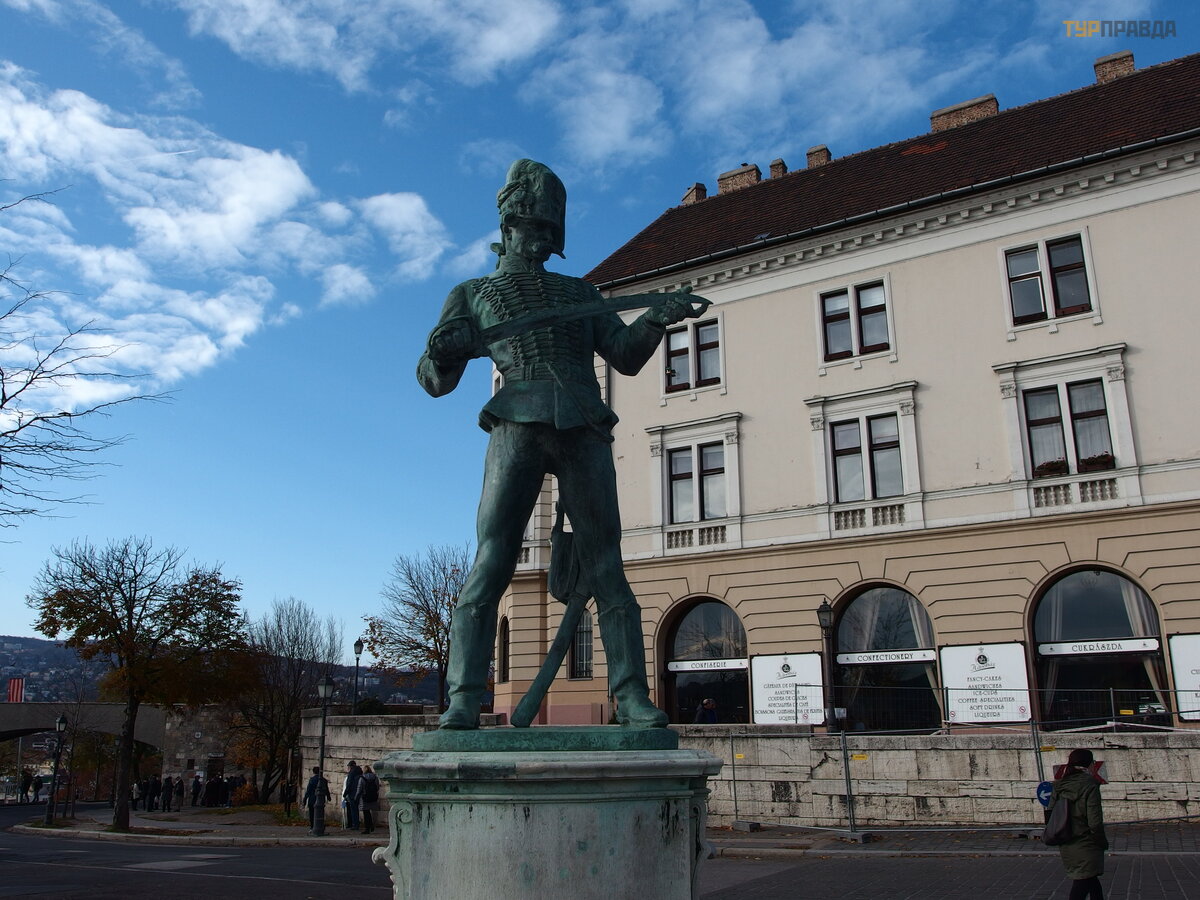 Выйдя на площадь Святого Георгия (Szent Gyö rgy té r), где в средние века проводились турниры и другие конные игры, стоит памятник гусару в униформе эпохи Марии Терезии. Автор памятника – скульптор Жигмонд Кишфалуди Штробль (Zsigmond Kisfaludi Stró bl) (1932). Жигмонд Штробль (1884-1975) также является автором фигуры Лайоша Кошута в мемориальной композиции у Венгерского парламента.