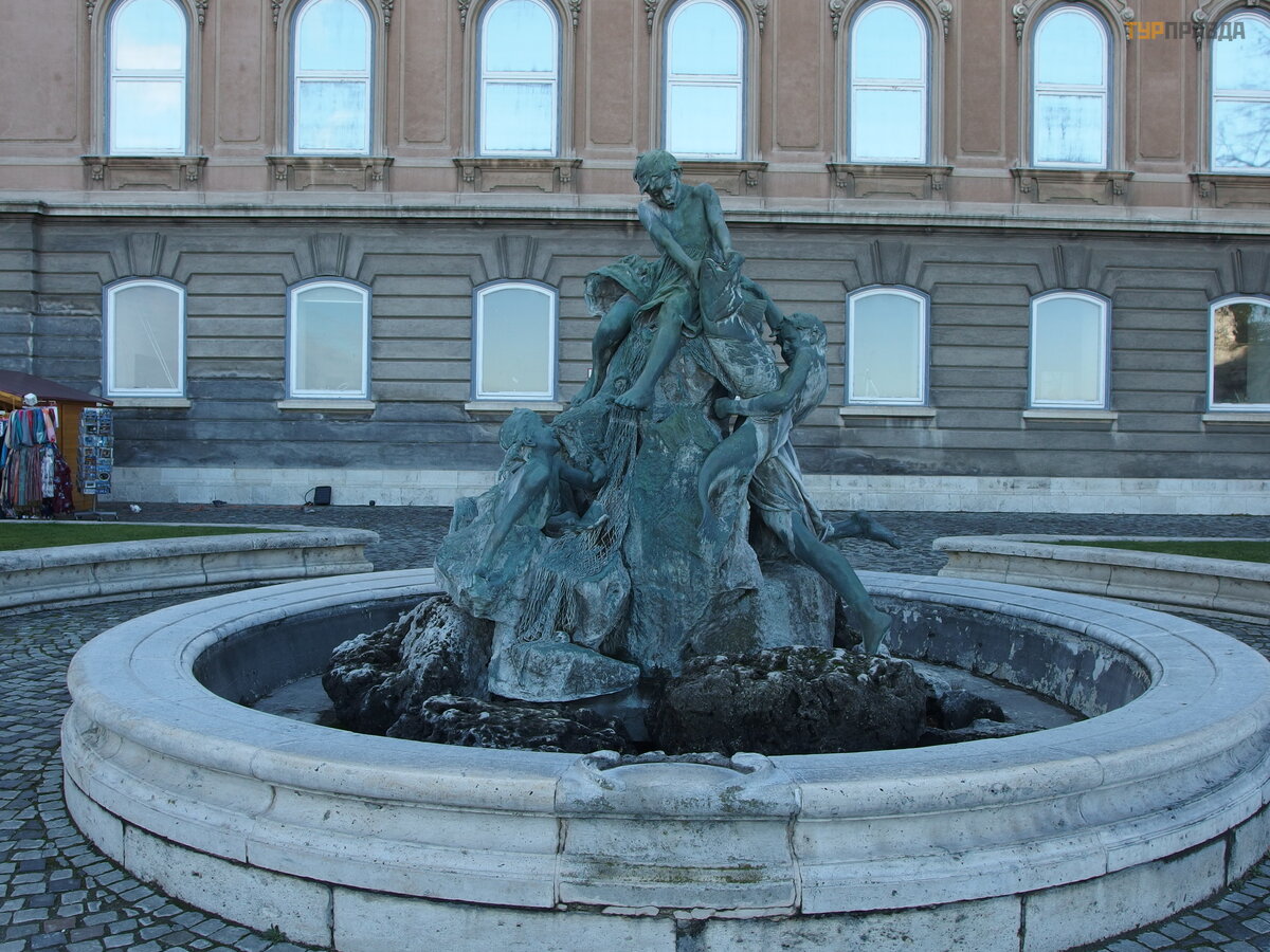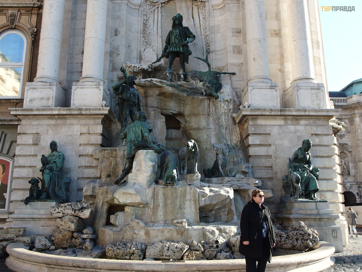 В западном дворике Королевского дворца, находится великолепный фонтан, изображающий охоту короля Матьяша (скульптор Алайош Штробль, Alajos Stró bl, 1904). Легенда гласит, что во время охоты Матьяш, которому нравилось переодеваться в простую одежду, встретил прекрасную Илонку, которая влюбилась в него, не догадываясь, что перед ней король. Композиция создана по мотивам баллады Михая Вёрёшмарти. Слева изображен летописец короля Матьяша (с соколом). Именно он первым записал эту романтическую легенду, впоследствии литературно обработанную Вёрёшмарти. Справа сидит та самая простолюдинка, Илонка Прекрасная. Как гласит легенда, узнав о том, что ее избранник не простой человек и ни о какой любви между ними не может быть и речи, влюбленная девушка зачахла и умерла. Скульптор изобразил и других охотников, очевидно, из свиты короля, в полном снаряжении, с охотничьим рогом и еще одним убитым зверем . Фонтан представляет собой кусок скалы с водопадом, на которой стоит сам король, у его ног лежит убитый олень, а рядом бегают легавые, одна из которых будто пьет воду из фонтана.