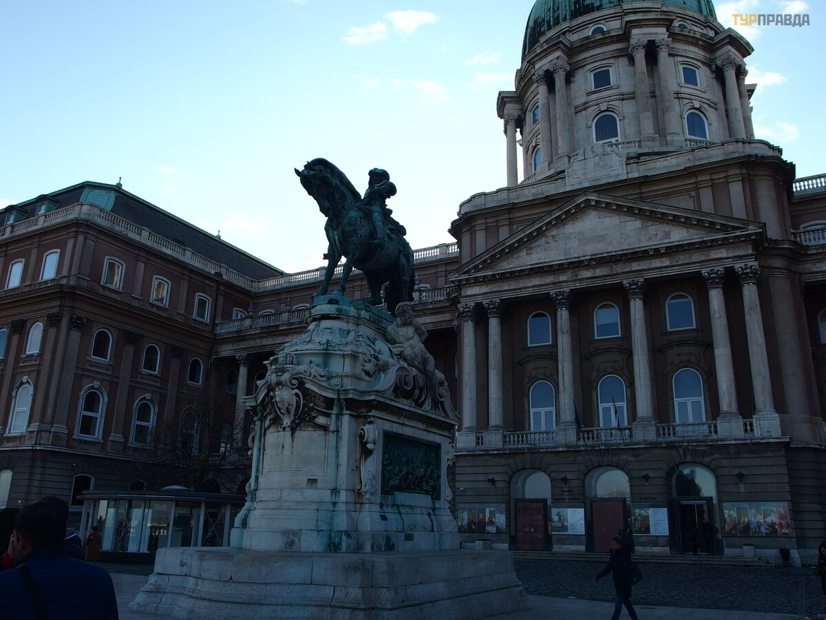 У центральной части Королевского дворца установлен памятник принцу Евгению Савойскому работы Йожефа Роны (Jó zsef Ró na, 1900), в память о победоносной битве при Зенте (1697 год), ставшей ключевым моментом в военных действиях с турками и способствовавшей заключению Карловицкого мира 1699 года. Принц сдерживает ретивого коня, у копыт которого в страхе дрожат пленные турки. Сцены битвы отражены в барельефах на постаменте: армия Евгения Савойского напала на войско султана Мустафы II, когда оно пересекало реку Тису, и разбила его, несмотря на значительное (почти в два раза) численное превосходство турок. Памятник был установлен в 1900 году при финансовой поддержке императора Франца Иосифа, которому пришлось вмешаться, когда стало ясно, что у города банально не хватает средств.