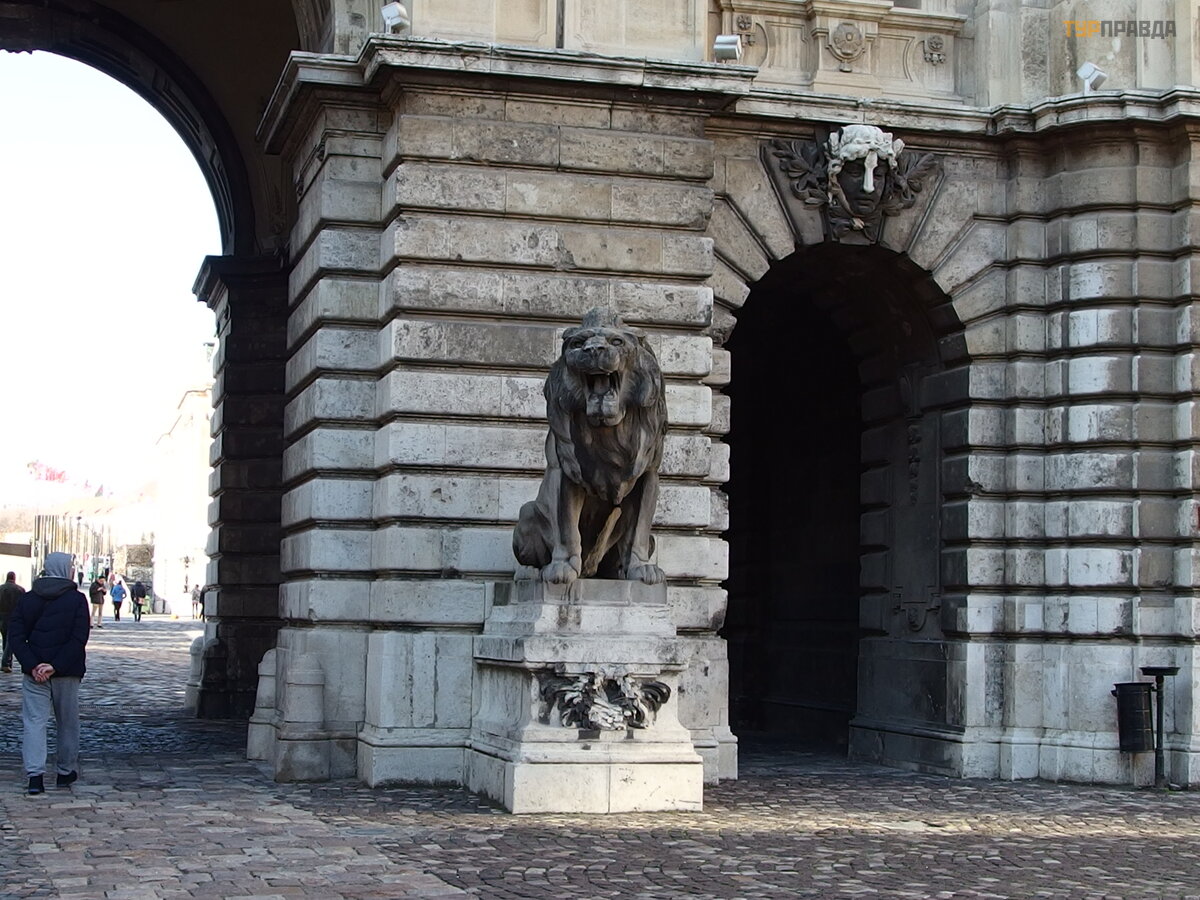 Совсем рядом с фонтаном видны Львиные ворота – арка, которая ведет во внутренний двор Королевского дворца. По обеим сторонам ворот сидят львы с закрытой пастью. Точно такие же львы, но с открытой пастью, находятся по другую сторону арки.