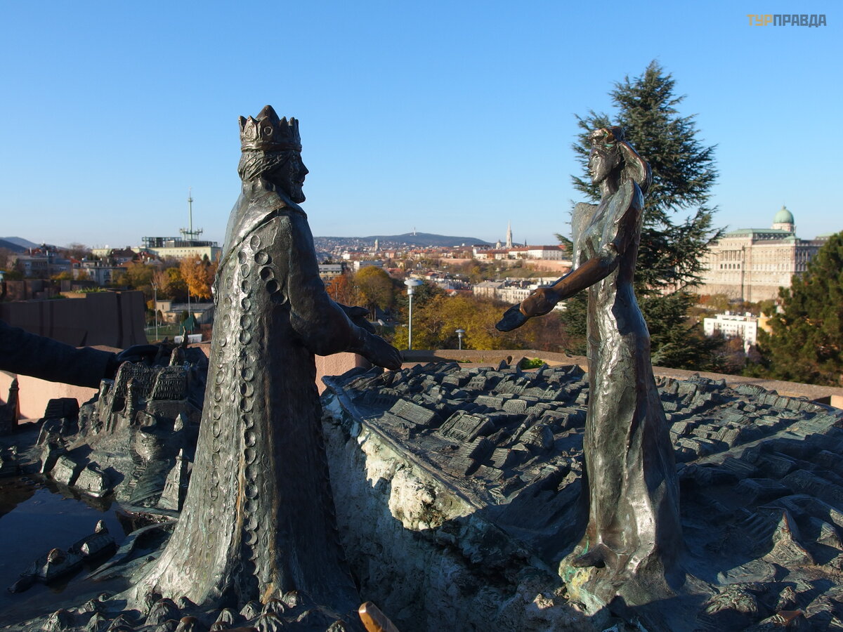 Paž odž iui iš vengrų kalbos Buda-kirá ly é s Pest-kisasszony pavadinimas verč iamas kaip „Budos karalius ir Peš to karalienė “. 1982 metais č ia atsirado architekto Lesenyei Má rtos sukurta skulptū ra. Pastebė tina, kad paminklas sumontuotas ant dangč io, vedanč io į rezervuarą , esantį po Gellerto kalnu. Paminklas nė ra labai didelis ir iš tolo jo net nepastebi. Kompozicija simbolizuoja dvi Budapeš to puses, kurias skiria Dunojus. Anksč iau Buda ir Peš tas buvo du atskiri miestai. Daugelis, pamatę paminklą , mano, kad jis skirtas Budapeš to formavimuisi. Taip nė ra, nes Budapeš tas susiformavo susijungus ne dviem miestams, o trims – Budai, Obudai ir Peš tui. Š is į vykis į vyko 1873 m. Buda ir Peš tas iš tiesia vienas kitam rankas, o už jos driekiasi bronzoje į kū nyti to paties pavadinimo miestai. Į paminklą kaip visumą ir atskiras jo detales galima ž iū rė ti ilgai. Taip pat atsiveria puikus vaizdas į Vengrijos sostinę .