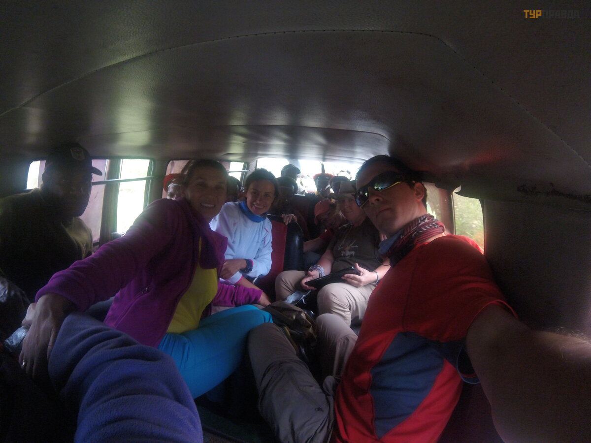 Važ iavome vietiniu autobusu kartu su rū kaliais, kurie grį ž o iš š ventė į savo kaimus. Mikroautobuse buvome 20 ž monių , pusė ant stogo