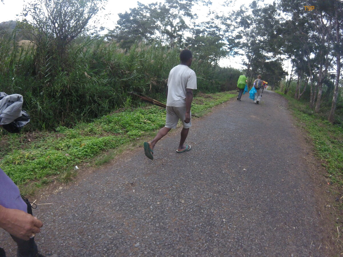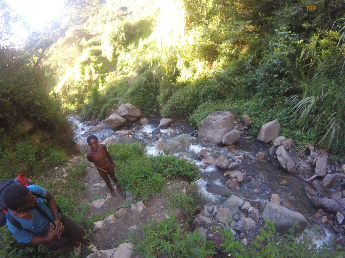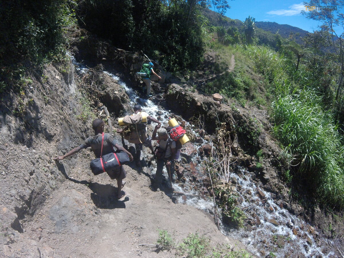 gavo antrą vė ją ! Š ios dienos marš rutas – dž iunglė se, nebebus kaitrios saulė s. Pritrū kome visų geriamojo vandens atsargų , todė l mums davė kariuomenė s filtrus ir kolbas. Vandens galima pasisemti net iš pelkė s, ką mes ir padarė me. Bet filtrų neš ikams nedavė , ir nors jie buvo vietiniai ir pripratę prie savo vandens, pradė jo viduriuoti, mes juos iš gelbė jome savo aktyvintomis anglimis, bet jie buvo iš blyš kę ir iš.3 neš ikų su mū sų atsiliekanč ia grupe liko tik vienas Raimondas . Labai daž nai kalnuose siaurais takeliais sutikdavome vietinius gyventojus, kurie mus visada pasitikdavo už rankos su badi arba bagi, jie eina pė sč iomis į Vameną į turgų maisto produktų ir atgal ant galvų , š iais ož kų takais jie neš tis sunkius pirkinių maiš elius su maistu, su vaikais, su vandeniu ir puodais. Ž iū rė ti juos – vienas malonumas, eini beveik ant plauč ių ir kvė puoji, su specialiais batais, su kombinezonu, o jie basi, o jų kojos kaip plekš tė s, ir č iuo-č o,