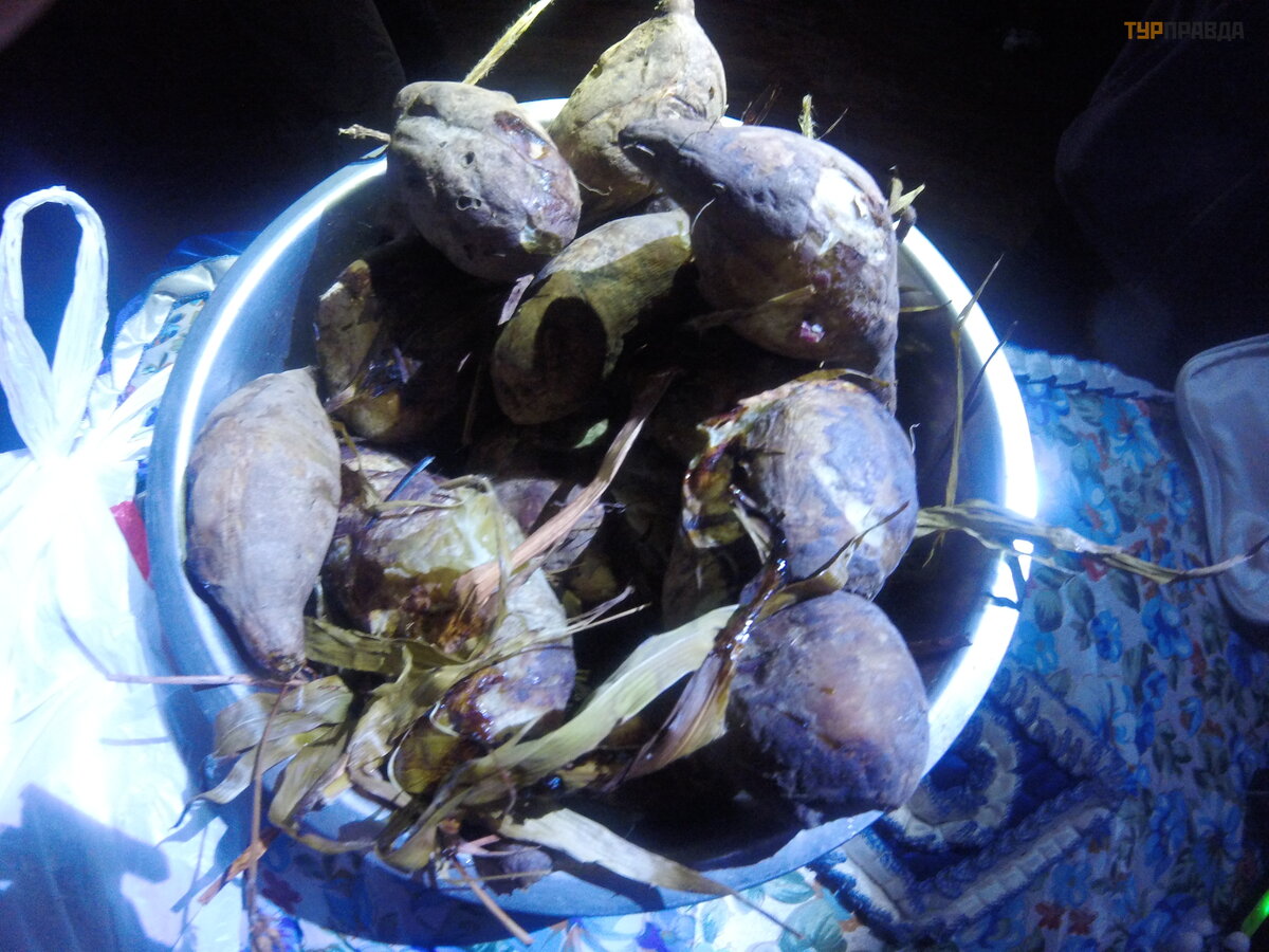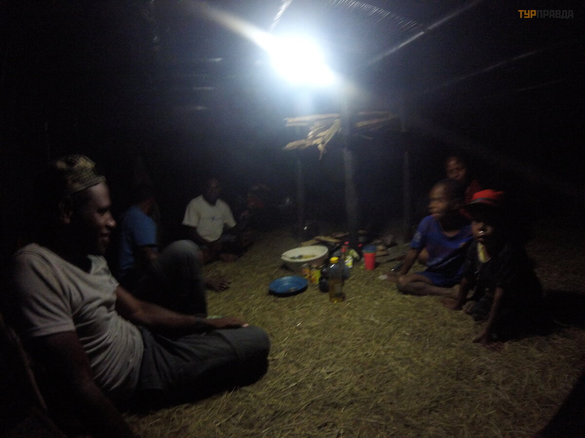 Labai greitai temsta 18:00, vos spė jome pasistatyti palapines. Eidavome pas vietinius į kaimą pavalgyti. Moteris, kuri net než ino, kiek jai metų yra virti javai (saldž iosios bulvė s) ir virti š ios darž ovė s lapai salotoms, nes turė jome alyvuogių , druskos, daug padaž ų , duonos ir net laš inių , vakarienė man patiko. Darė me jai sumuš tinį su juoda duona, garstyč iomis ir laš iniais, valgė , skaniai kalbė jo.