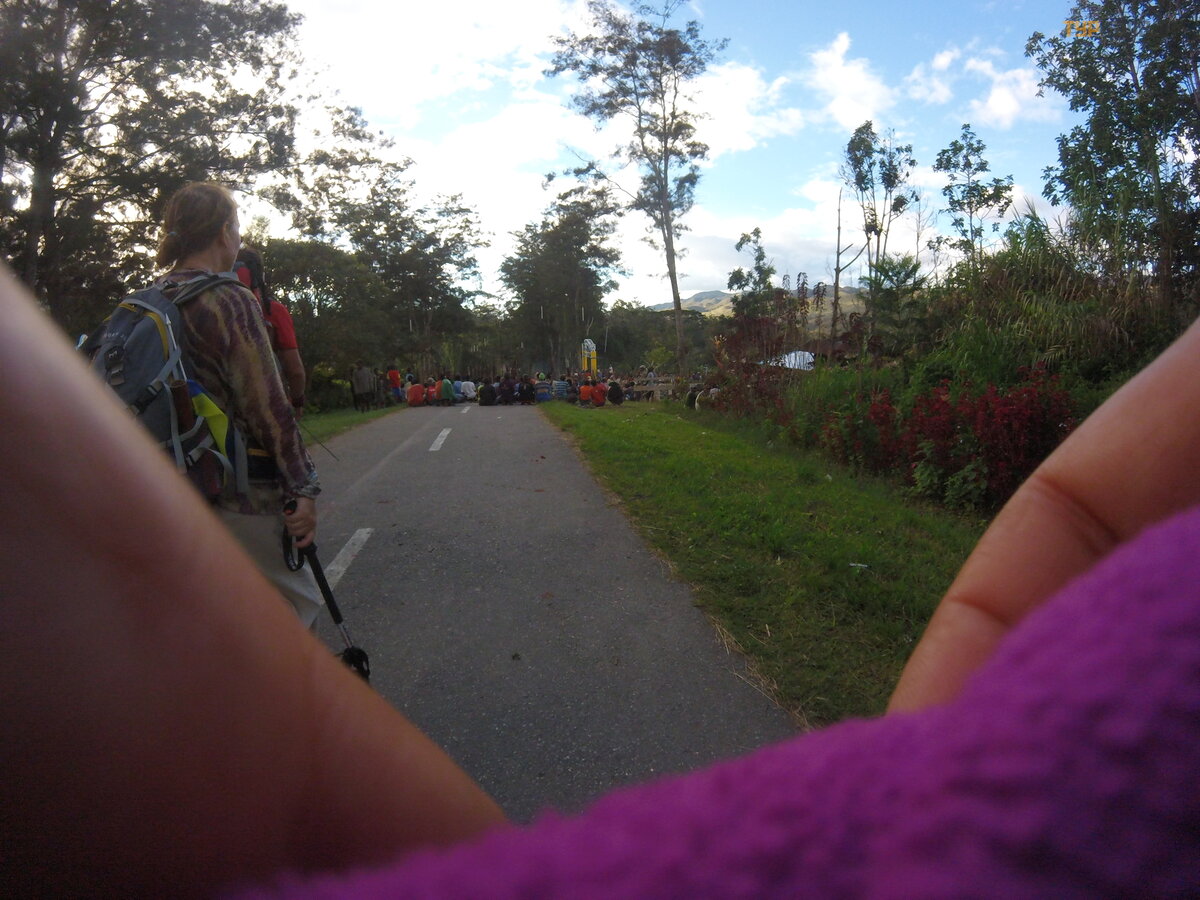 Kai pagaliau nusileidome, vietiniai papasakojo, kad kilo karinis konfliktas. Kaž koks girtas iš vieno kaimo mirtinai pargriovė du ž mones iš kito kaimo ir turė jo atsipirkti kiaulė mis ir ryž iais, jis to nepadarė ,