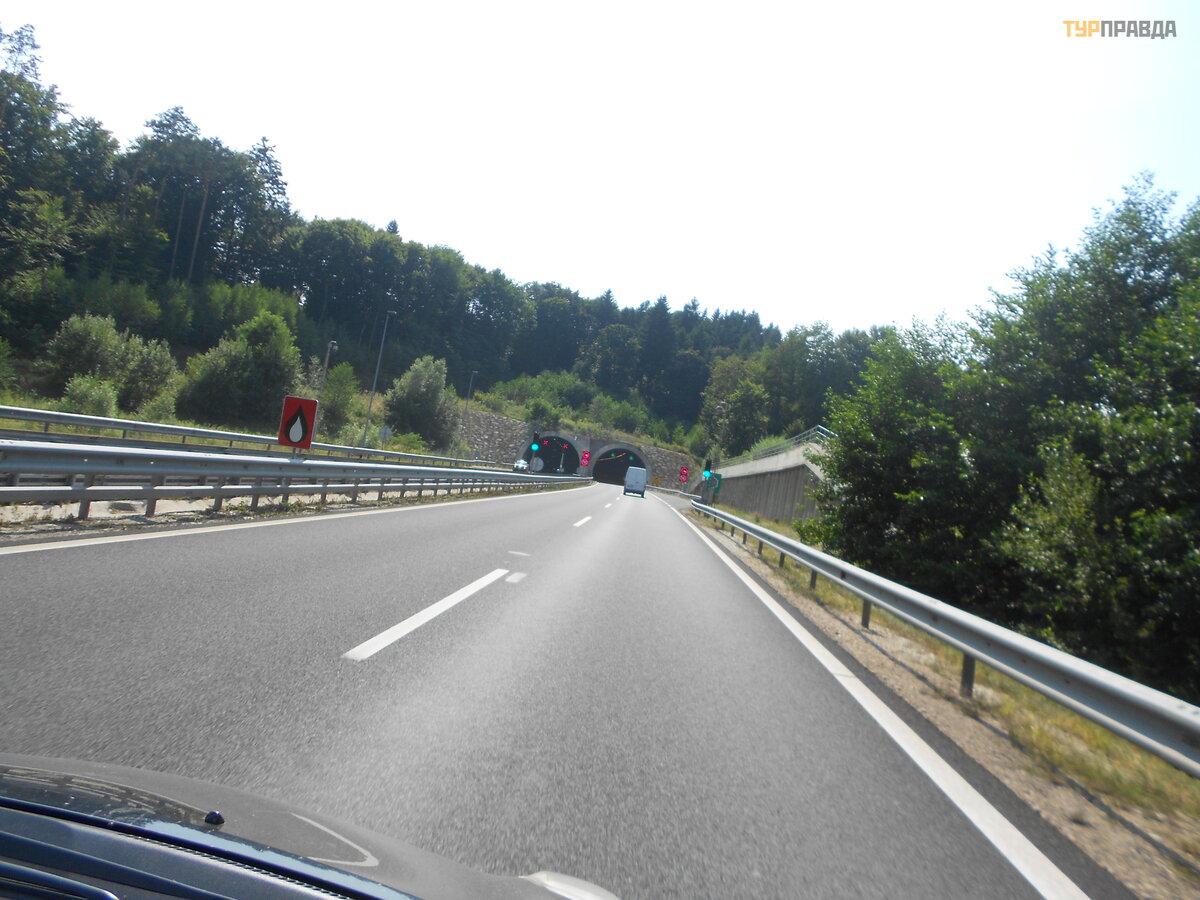 Siena su Slovė nija praskriejo nepastebimai. Degalinė je sustojame nusipirkti vinjetė s susimokė ti už kelius ir į sipilti kuro. Navigatorius veda į Liublianos aplinkkelį , leidž iantį neš vaistyti laiko kelyje, tač iau už lango peizaž ai slegianč iai monotoniš ki. Tač iau netrukus pasirodo kalnai, kelias tampa vaizdingesnis, eina per daugybę tunelių .