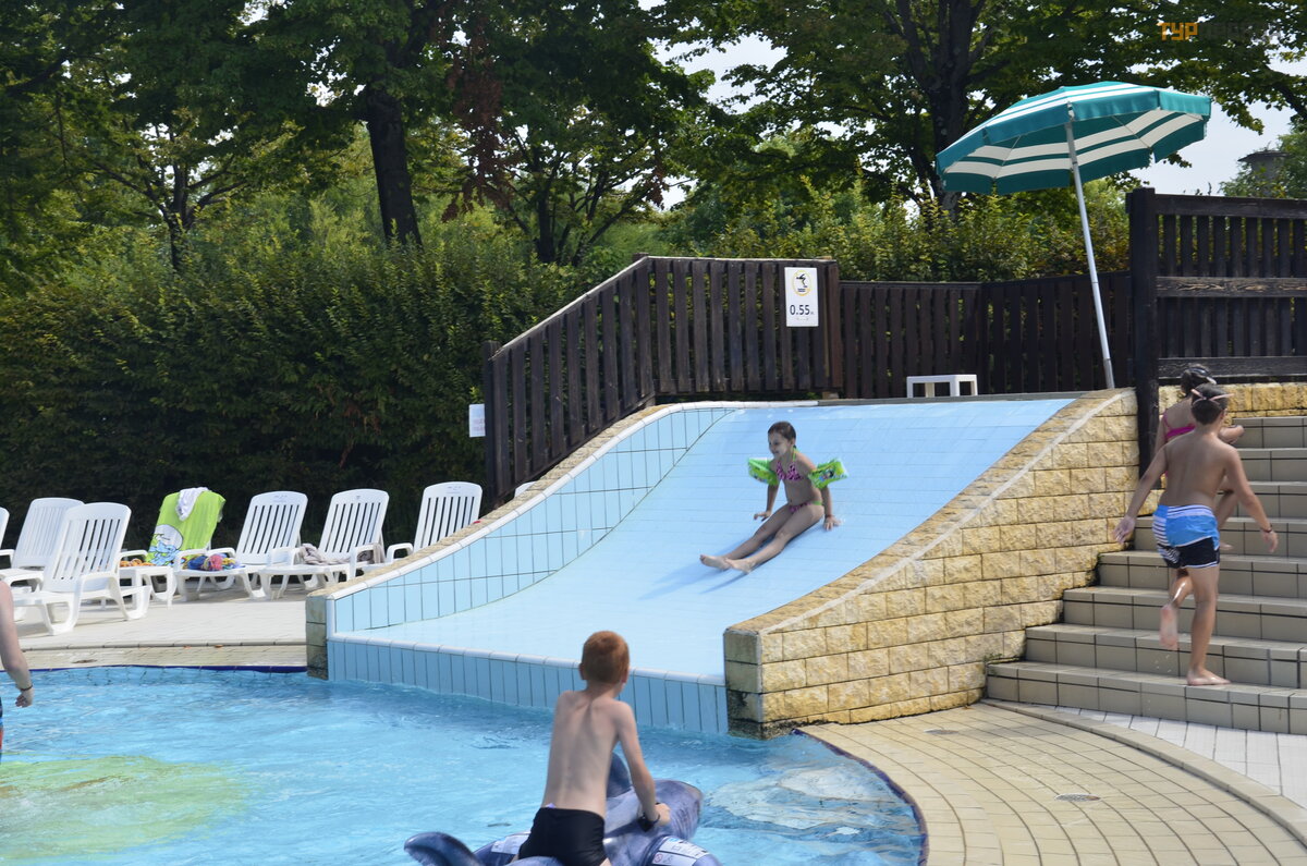 Vieną popietę aplankė me vietinį vandens parką . Bilietas suaugusiems 16 eurų , vaikams 14 eurų . Skaidrė s bet kokiam amž iui, ypač suž avė jo atrakcija, kur iš skrendi kaip kamš tis iš butelio.