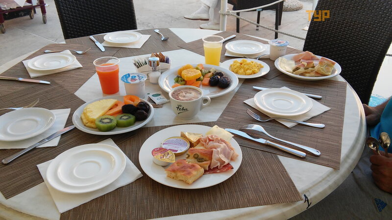 Kambaryje buvo oro kondicionierius, š aldytuvas, plaukų dž iovintuvas ir tinkami baldai. Na, nuė jome papusryč iauti į restoraną . Š is restoranas buvo geriausias iš visų š ioje kelionė je, o Italijoje turė jome tik 4 * vieš butį . Maisto pusryč iams pasirinkimas buvo labai į vairus, į skaitant š altus gabalė lius, vaisius, pyragus ir net pikantiš ką cava.